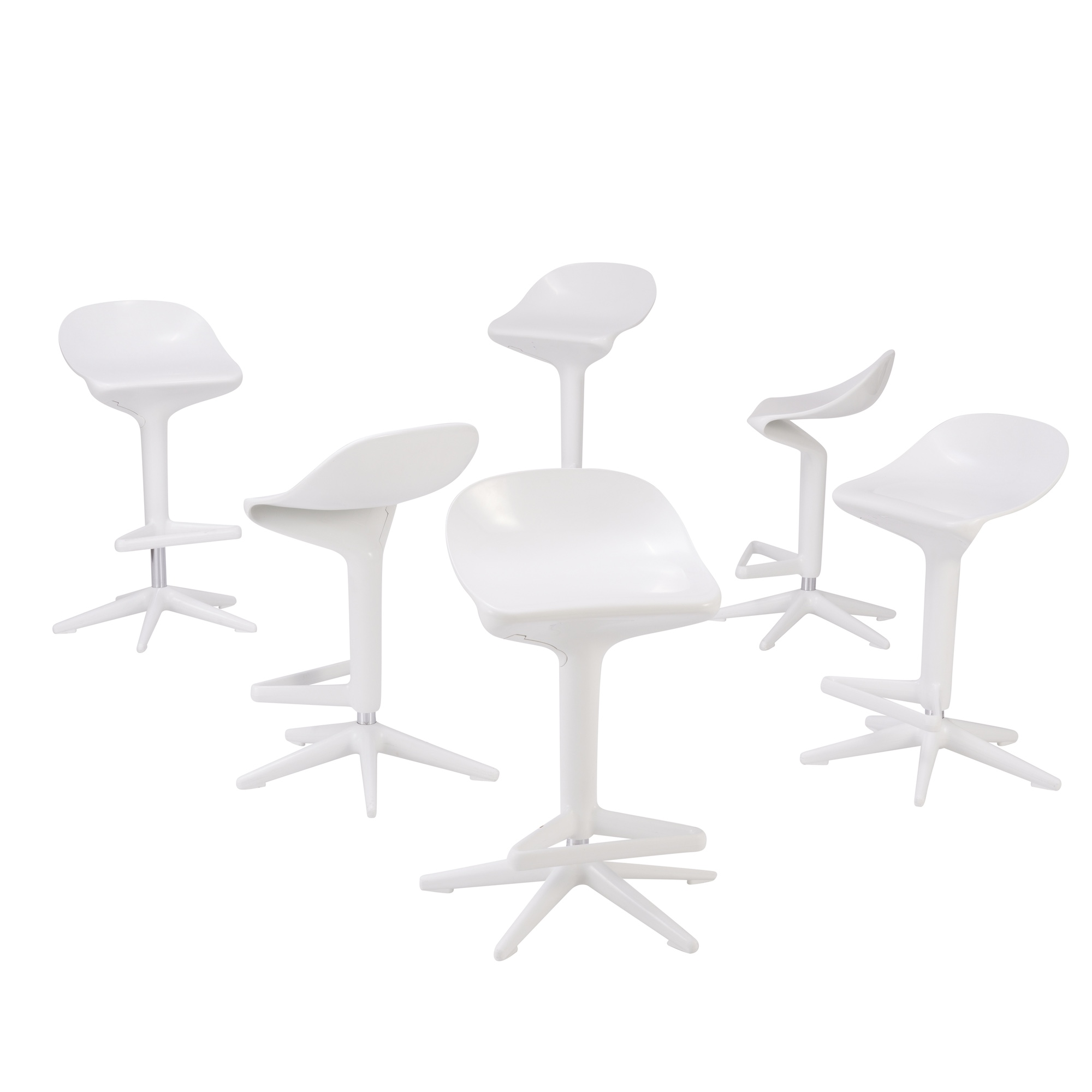 Scuffing and light scratches to seat shells, footrests and top of leg spokes. Some stools have clusters of dents to plastic. No obvious losses.
