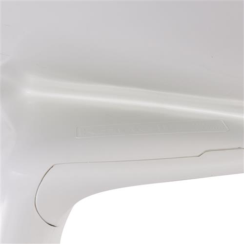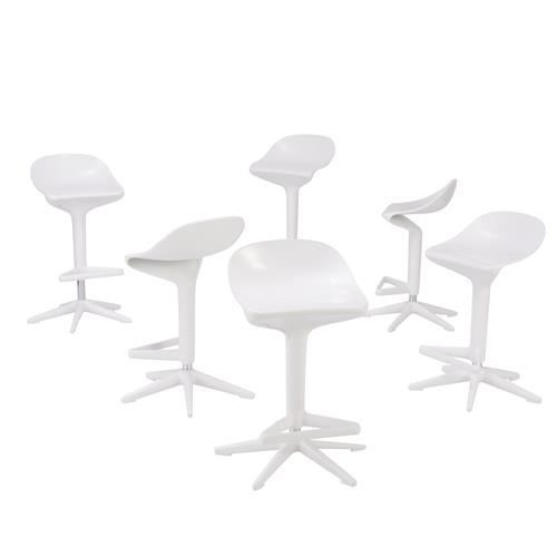White plastic cantilevered scooped seat with footrest and gas lift height adjustment.