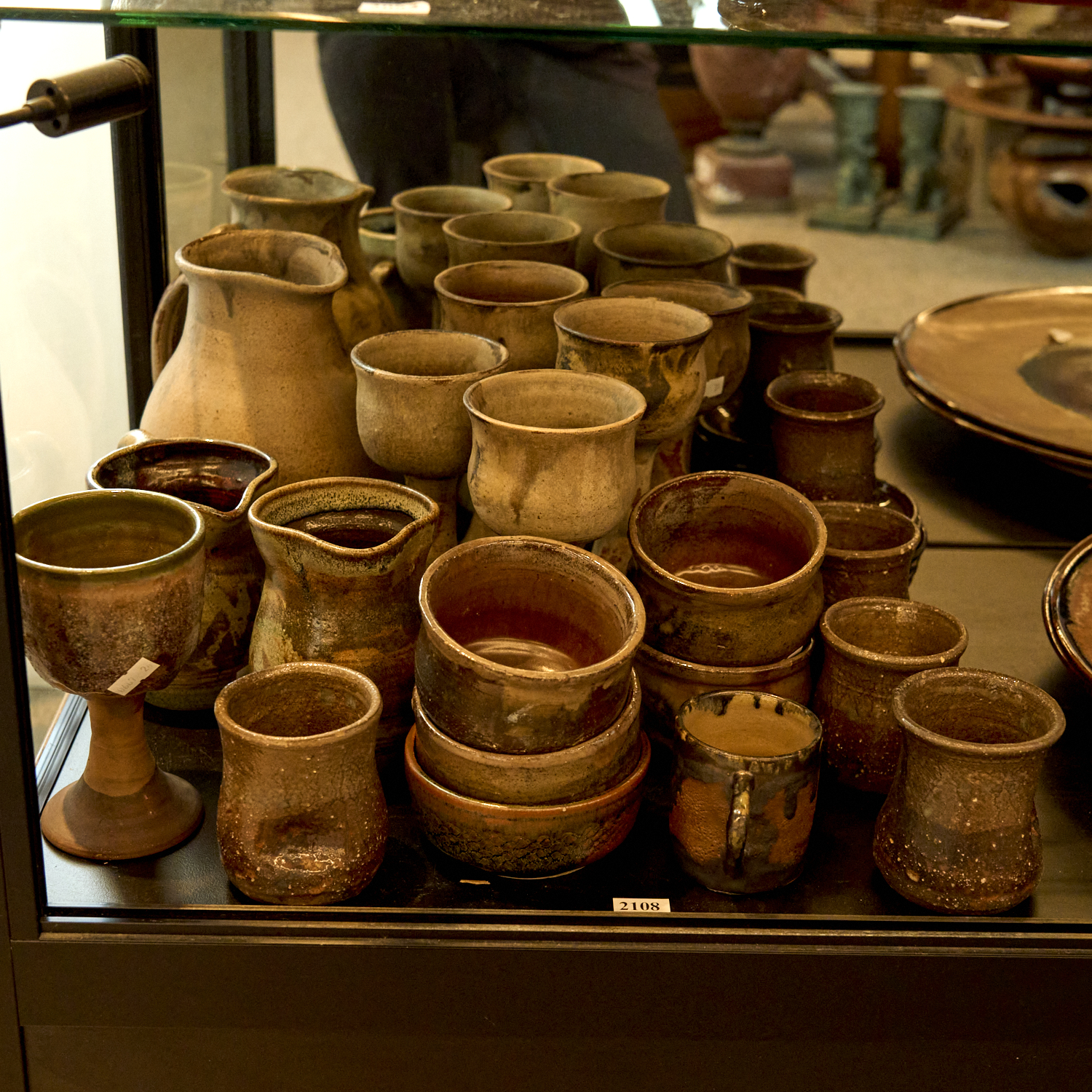 A LARGE COLLECTION OF STONEWARE POTTERY INCLUDING A SET OF GOBLETS, THREE JUGS, VARIOUS RAMEKINS AND POTS, SOME BY HATTON BECK H.21CM (TALLEST)