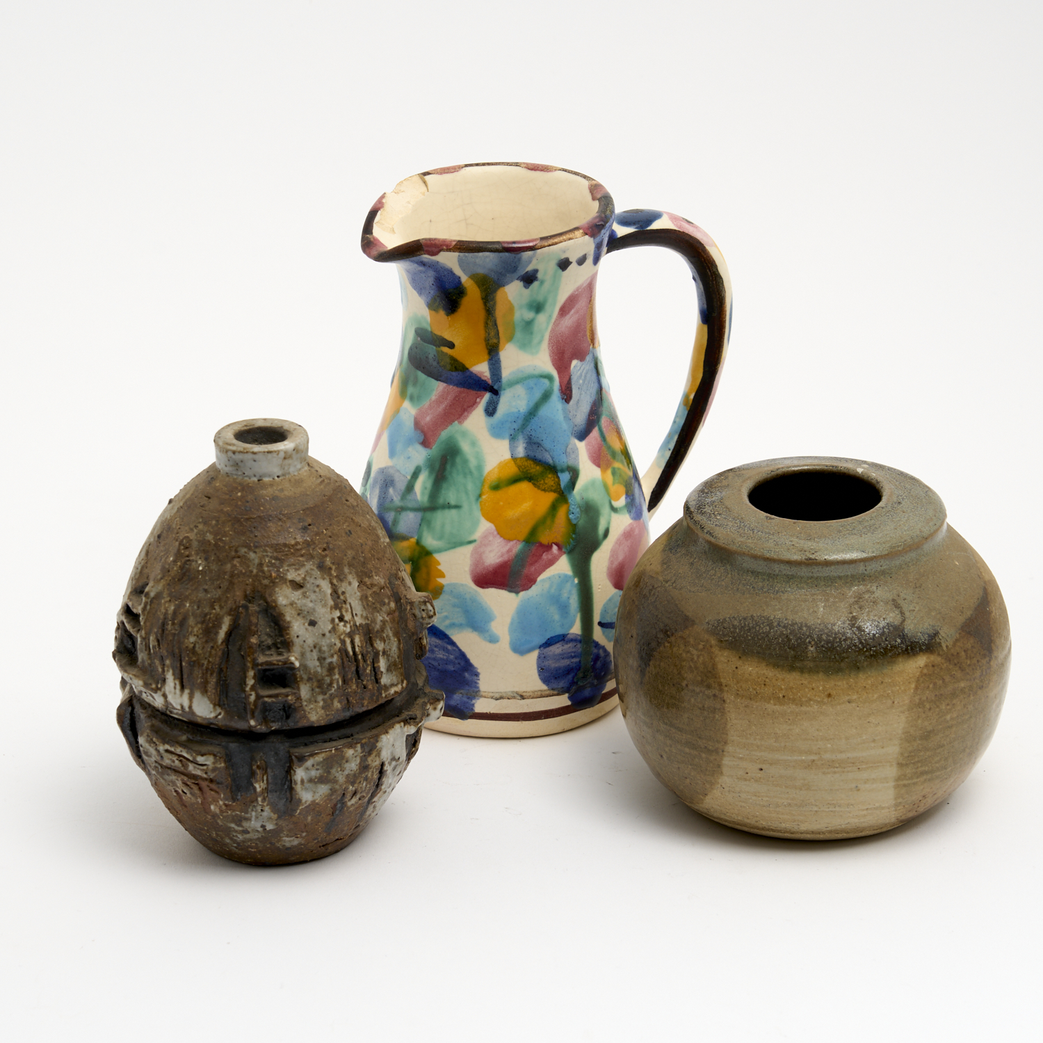THREE PIECES OF AUSTRALIAN POTTERY INCLUDING A GUS MCLAREN TWO SECTIONAL POTTERY VESSEL, AN ELSA ARDERN POT AND A DEBRA HALPERN JUG (A/F) H.18CM