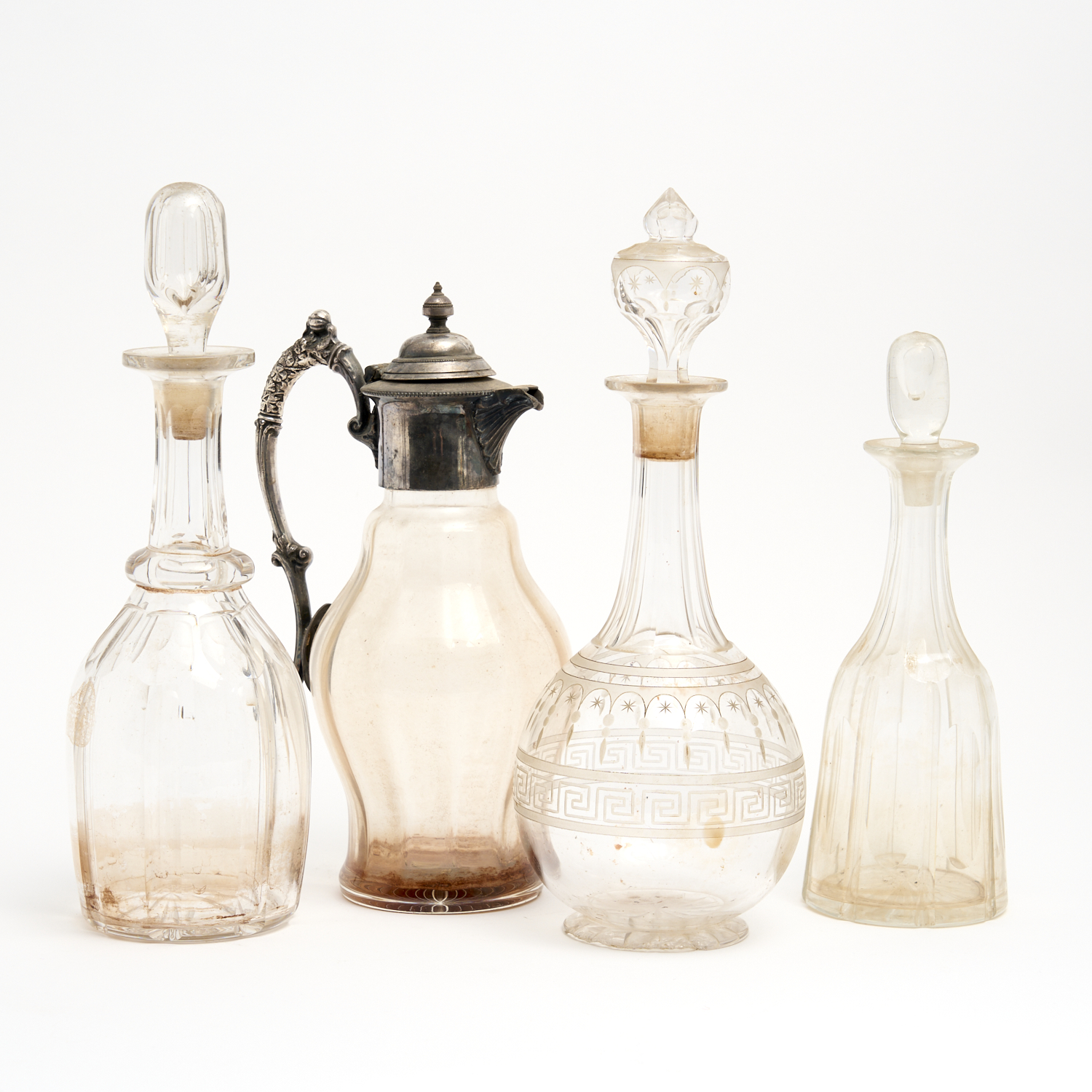 THREE ANTIQUE CRYSTAL DECANTERS TOGETHER WITH A SILVER PLATE MOUNTED CLARET JUG (A/F) H.32.5CM (TALLEST)