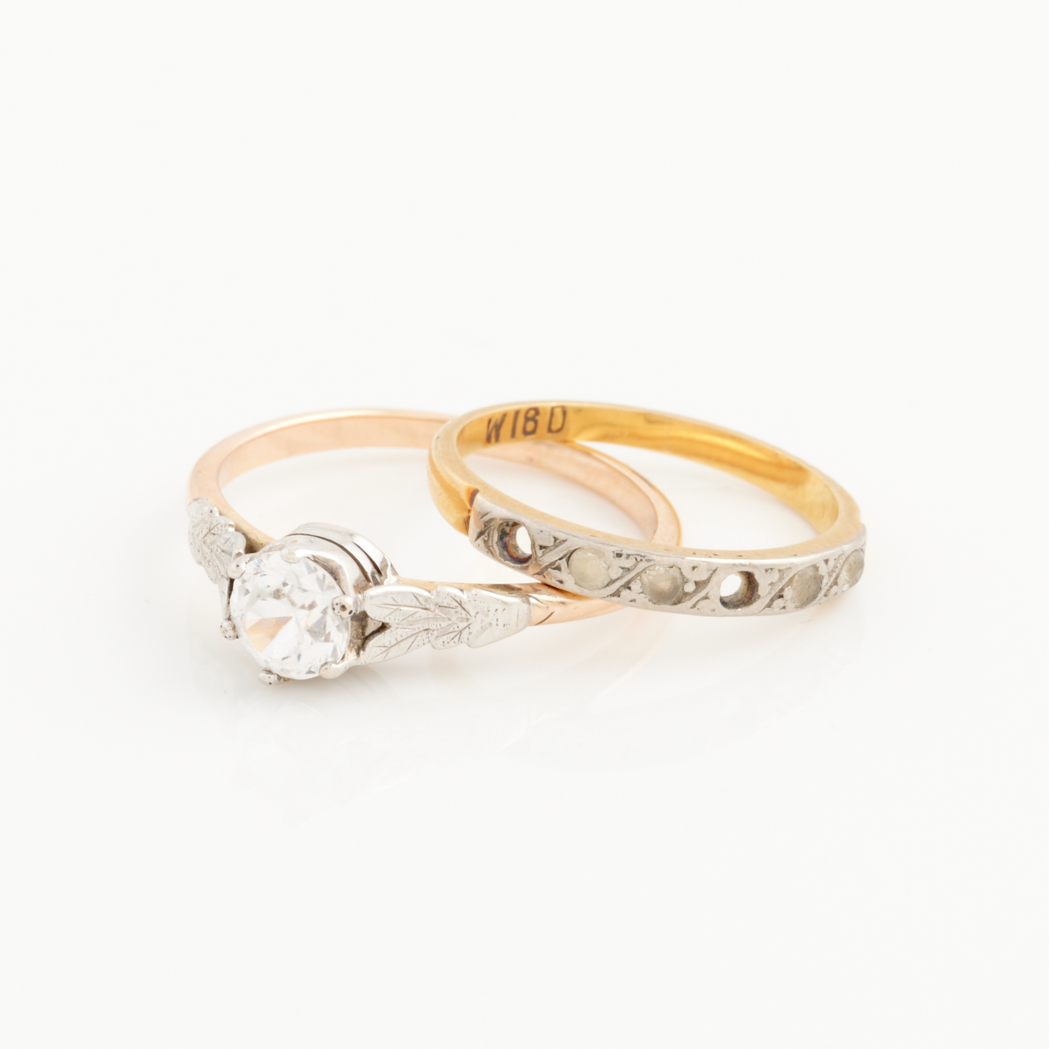 A WHITE SAPPHIRE RING IN TWO-TONE 9CT GOLD, SIZE P, TOGETHER WITH A WHITE GEM BAND IN TWO-TONE 18CT GOLD, SIZE K, 3.7GMS, A/F
