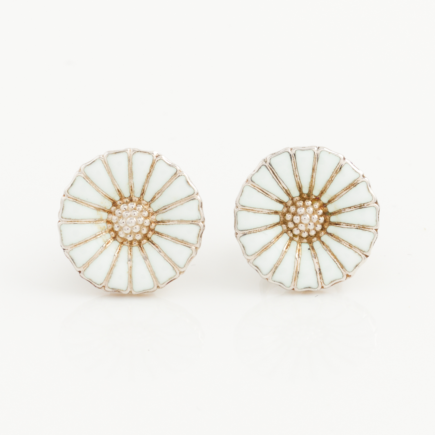GEORG JENSEN, A PAIR OF ENAMEL DAISY EARRINGS IN STERLING SILVER, TO POST AND BUTTERFLY FITTINGS, DIAMETER 11MM, ACCOMPANIED BY A GEORG JENSEN POUCH