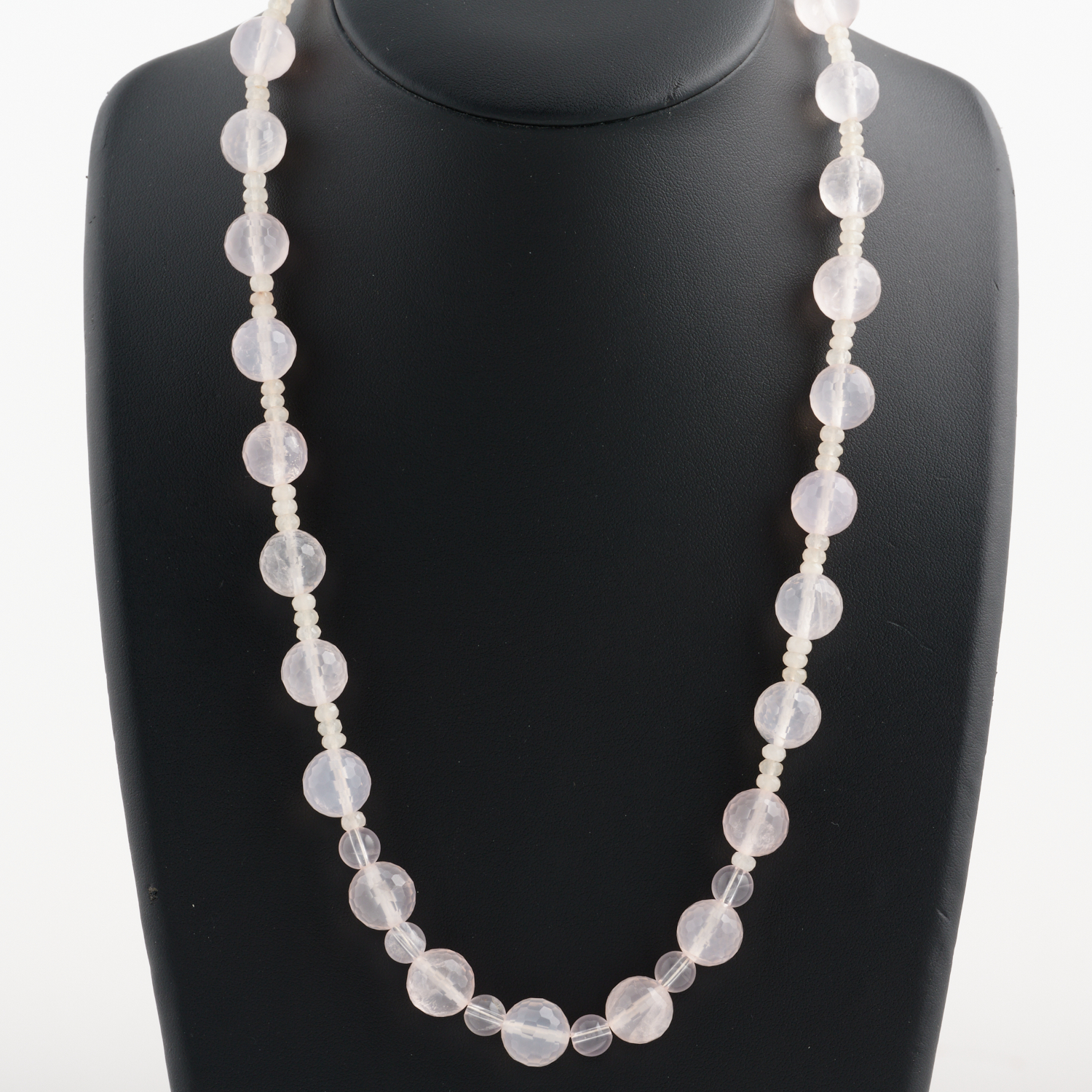 A STRAND OF FACETED ROSE QUARTZ BEADS TO A T-BAR CLASP, 520MM