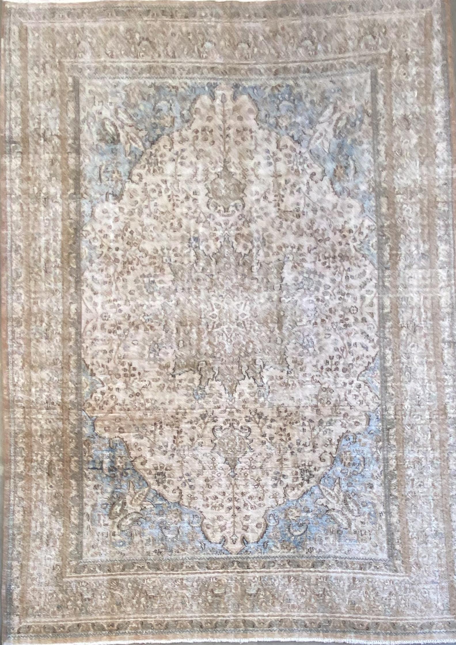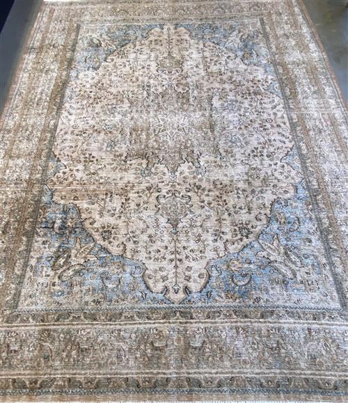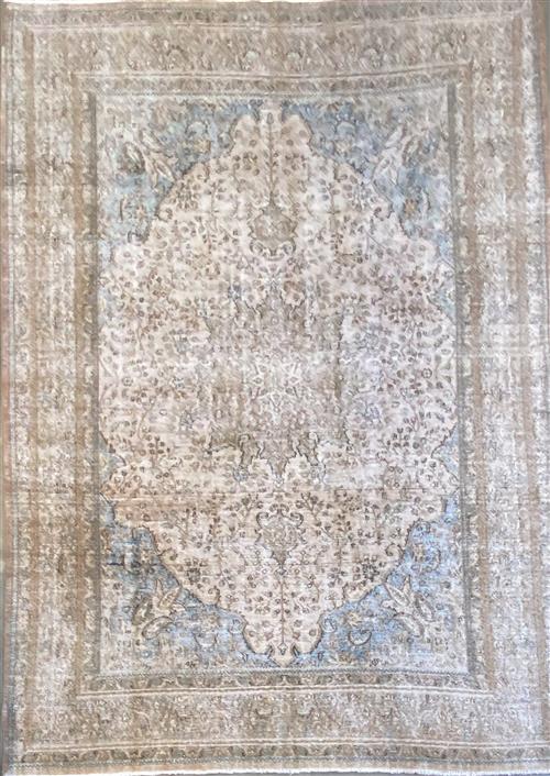 A SUBTLE-TONED CONTEMPORARY TRANSITIONAL PERSIAN KERMAN CARPET. A DESIGNER RUG CREATED FROM A HAND-KNOTTED PERSIAN KERMAN WITH A BOLD MEDALLION DESIGN. THE RUG IS UNIQUELY HAND-DYED IN SHADES OF PEACH, BISCUIT & CORNFLOWER BLUE. EX- GALLERY EXHIBITED. CERTIFICATE OF AUTHENTICITY & ORIGIN ON REQUEST. SIZE: 385 X 294 CM - ORIGIN: IRAN (PLEASE NOTE THERE MAY BE SOME COLOUR VARIATION FROM PHOTOGRAPH)