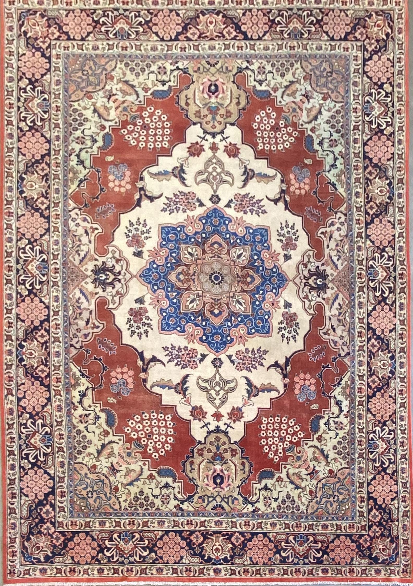 A 1940s PERSIAN TABRIZ CARPET WITH A SEMI- VINTAGE WOOLLEN PILE & ALL VEGETABLE DYES. HAND-KNOTTED CITY WEAVE FROM THE NORTH-WESTERN AZERBAIJAN PROVINCE WITH UNIQUE DESIGN OF A BOLD MEDALLION IN A PRIMARY CREAM FIELD 0F FLORAL SPRAYS AND SECONDARY MADDER-TONED FIELD WITH URNS BEARING FLORAL FOLIAGE & PAISLEY MOTIFS IN CORNER MEDALLIONS. INDIGO-TONED FIELD OF ALTERNATING PALMETTES AND FLORAL SPRAYS. PROFESSIONALLY RESTORED. CERTIFICATE OF AUTHENTICITY & ORIGIN ON REQUEST. SIZE: 353 X 256 CM - ORIGIN: IRAN (PLEASE NOTE THERE MAY BE SOME COLOUR VARIATION FROM PHOTOGRAPH)