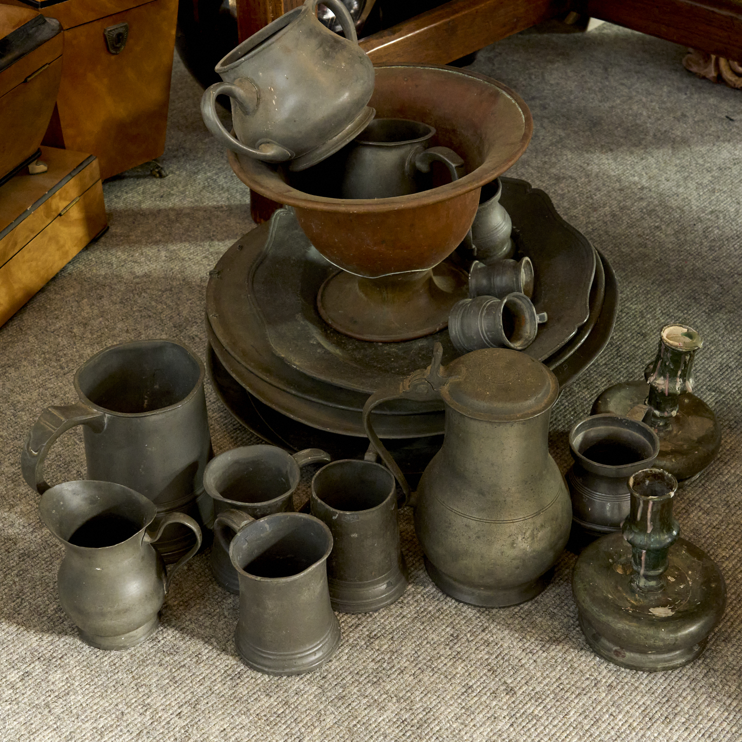 A LARGE COLLECTION OF ANTIQUE PEWTER INCLUDING TRAYS, TANKARDS, AND CANDLESTICKS