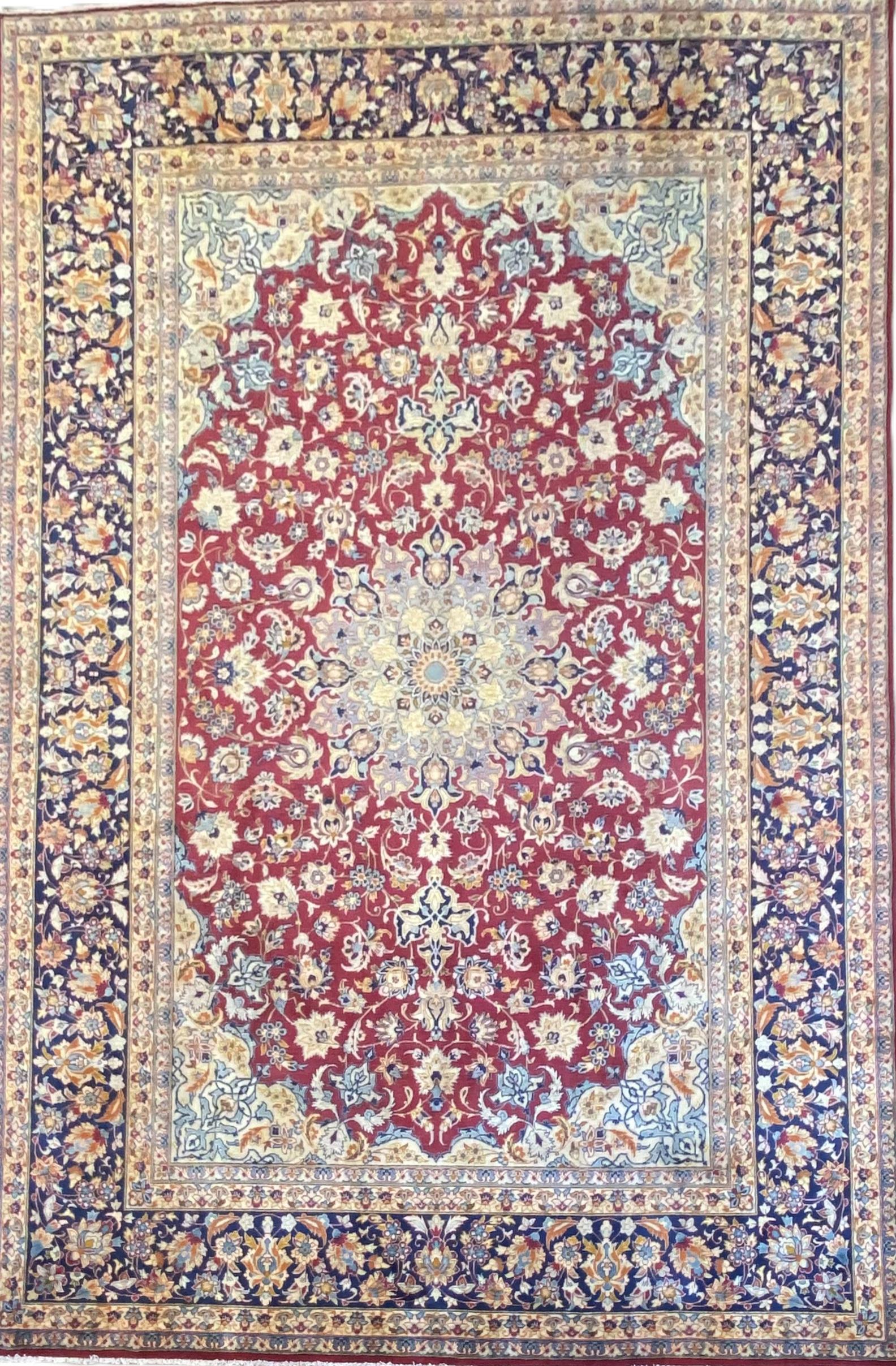 A MID 20TH CENTURY PERSIAN ISFAHAN, 100% WOOLLEN PILE, FINELY HAND- KNOTTED WEAVE. CLASSIC ISFAHAN DESIGN WITH A UNIQUE CIRCULAR SUNBURST FLORAL MEDALLION WITH PENDANTS IN AN OVAL RUBY RED FIELD OF SHAH ABBASSI PALMETTES & FLORAL SPRAYS. INDIGO BORDER OF PALMETTES, BLOSSOMING FLORAL SPRAYS & SAZ LEAVES. EX-GALLERY EXHIBITED. CERTIFICATE OF AUTHENTICITY & ORIGIN ON REQUEST. SIZE: 410 X 290 CM - ORIGIN: IRAN (PLEASE NOTE THERE MAY BE SOME COLOUR VARIATION FROM PHOTOGRAPH)