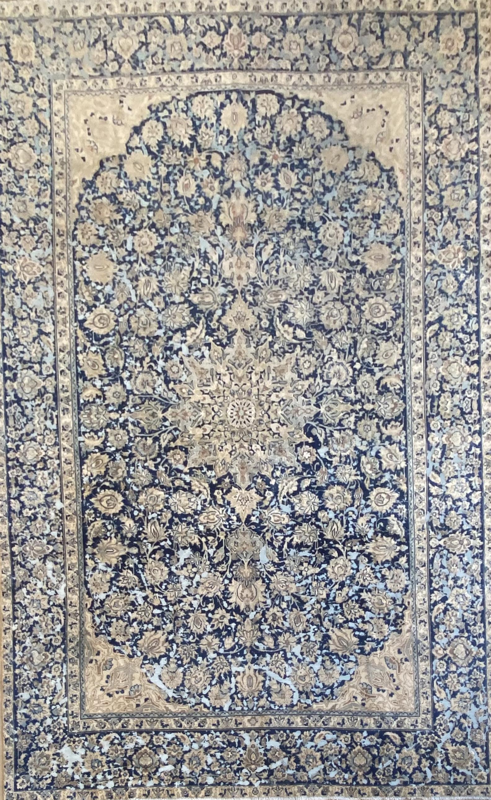 A DECORATIVE CONTEMPORARY TRANSITIONAL PERSIAN KASHAN CARPET. A DESIGNER RUG CREATED FROM A HAND-KNOTTED PERSIAN KASHAN WITH A MEDALLION DESIGN. VINTAGE PILE WITH EMBOSSED PATTERNS. THE RUG IS UNIQUELY HAND-DYED IN SHADES OF INDIGO, BISCUIT AND CARAMEL. EX-GALLERY EXHIBITED. CERTIFICATE OF AUTHENTICITY & ORIGIN ON REQUEST. SIZE: 397 X 267 CM - ORIGIN: IRAN (PLEASE NOTE THERE MAY BE SOME COLOUR VARIATION FROM PHOTOGRAPH)