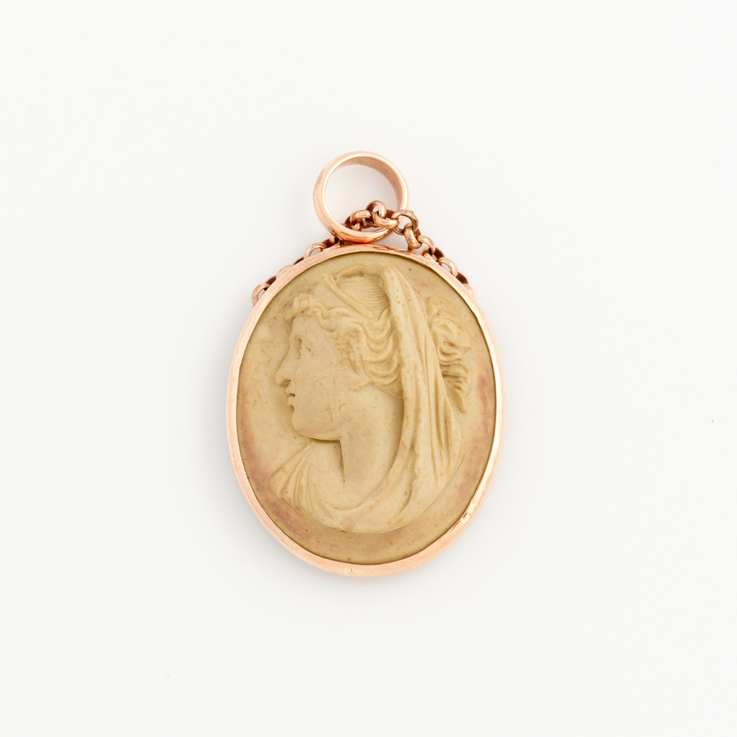 AN ANTIQUE LAVA CAMEO PENDANT IN 9CT GOLD, 40 X 24MM