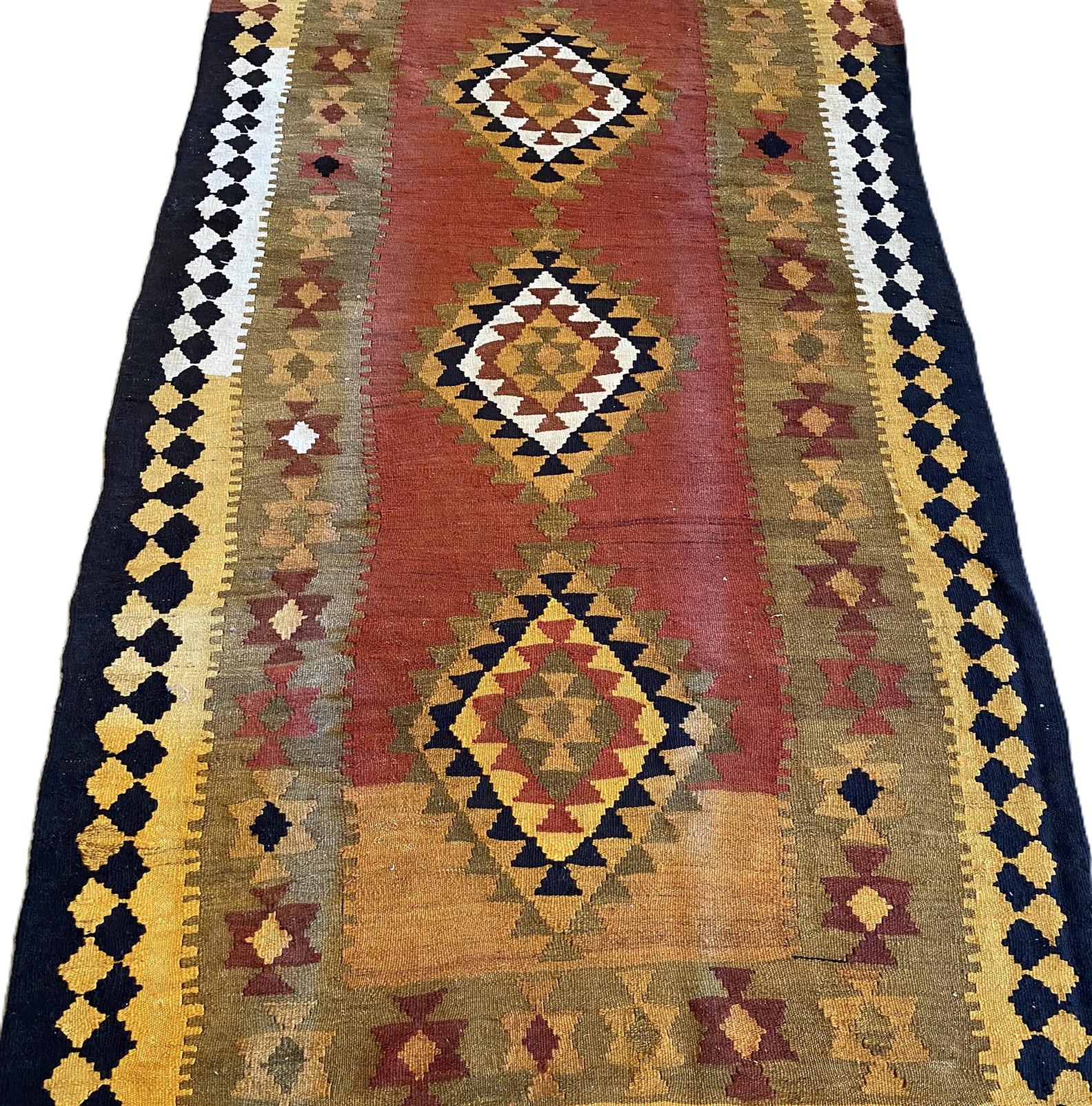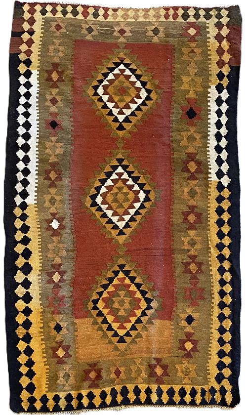 A TRIBAL PERSIAN QASHQAI KILIM, HAND WOVEN WITH 100% WOOL AND VEGETABLE DYES. TRIBAL DESIGN OF TRIPLE DIAMOND-SHAPED MEDALLIONS IN AN OPEN FIELD. GEOMETRIC BORDER. HAND WOVEN IN SOUTHERN PERSIAN PROVINCE OF FARS. SIZE: 260 X 148 CM - ORIGIN: IRAN