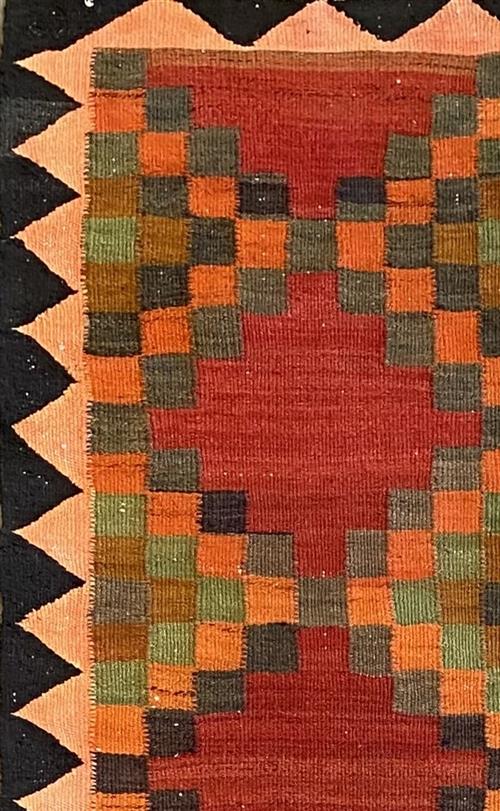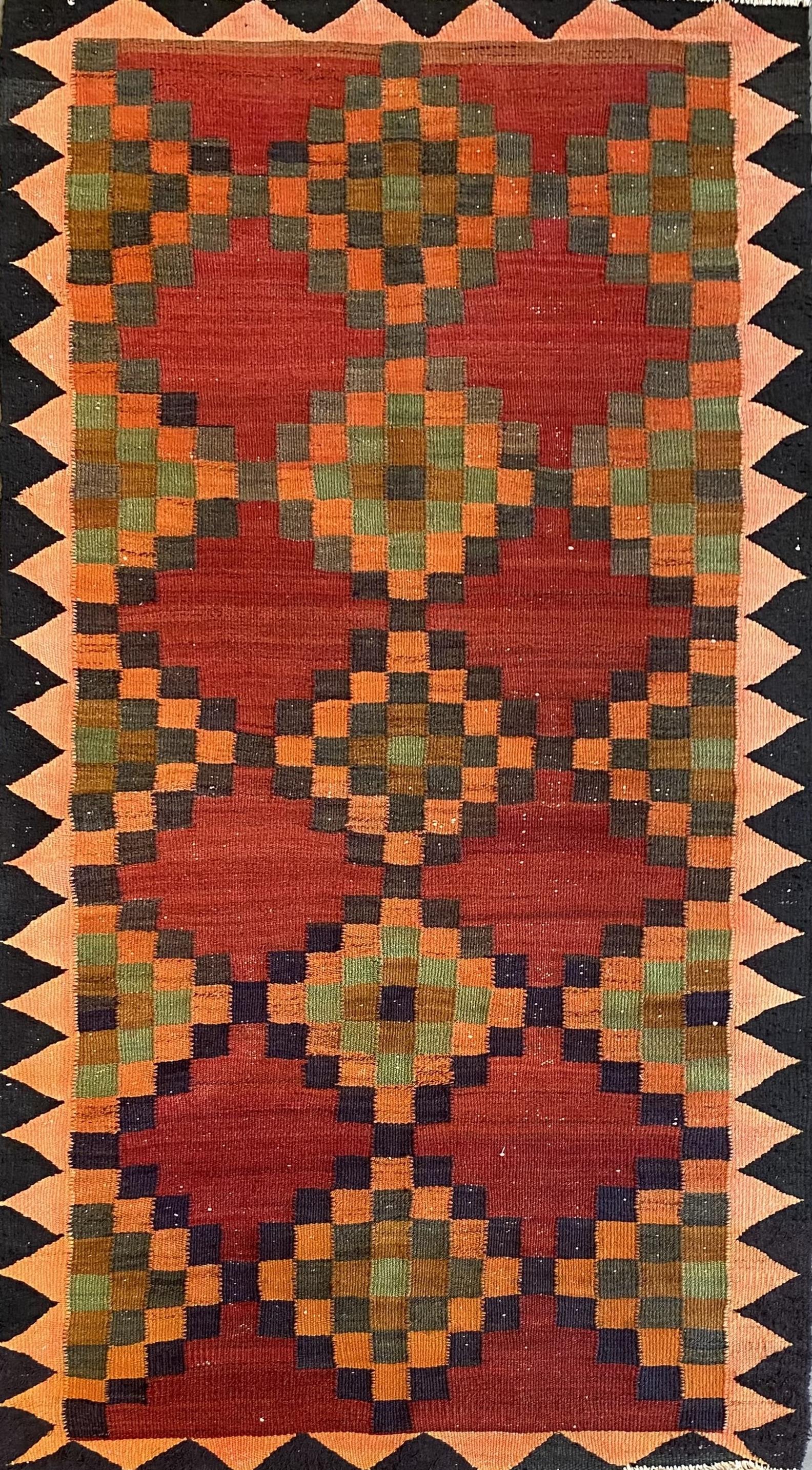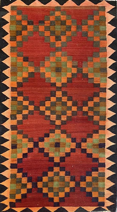 A LARGE TRIBAL PERSIAN QASHQAI KILIM, HAND WOVEN WITH 100% WOOL AND VEGETABLE DYES. TRIBAL DESIGN OF REPEATING DIAMOND-SHAPED MEDALLIONS & SEMI-MEDALLIONS. HAND WOVEN IN SOUTHERN PERSIAN PROVINCE OF FARS. SIZE: 305 X 167 CM - ORIGIN: IRAN