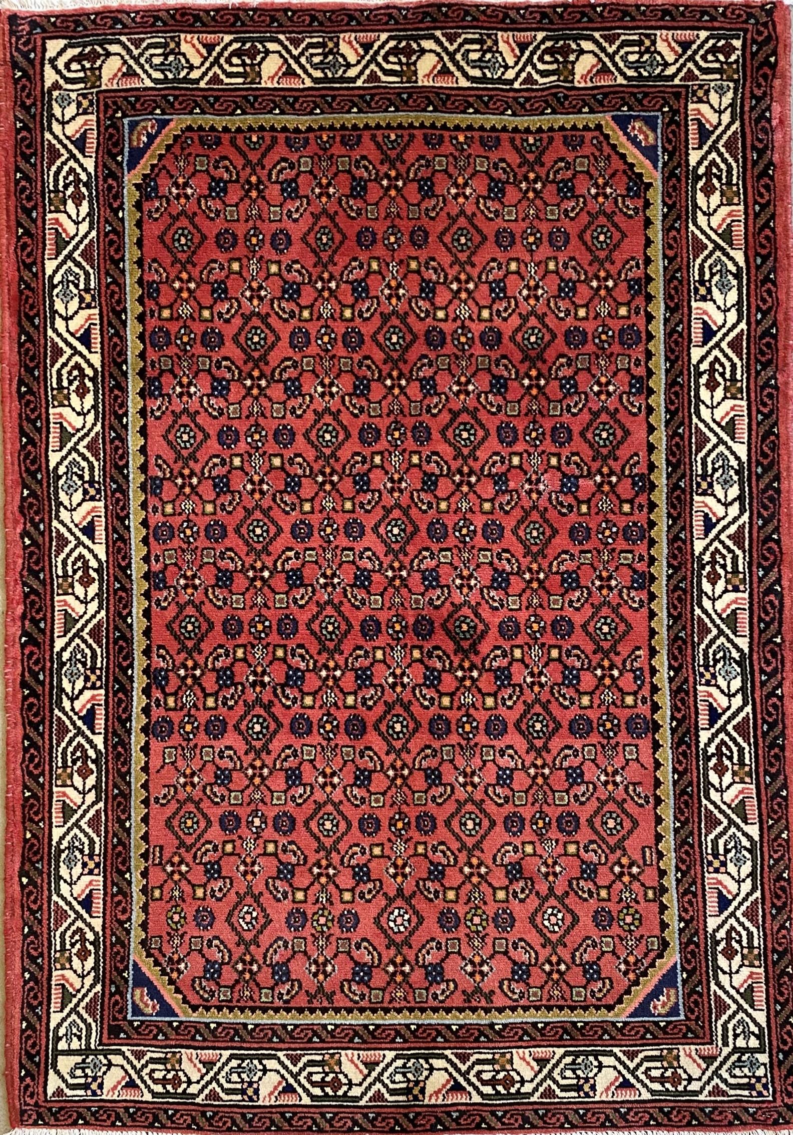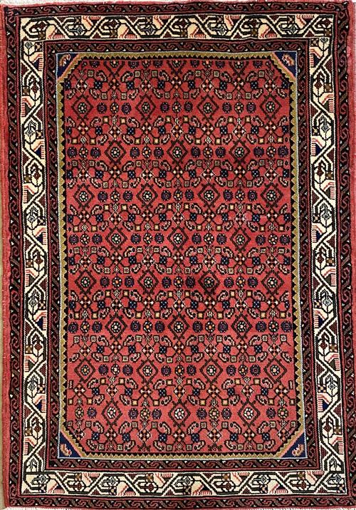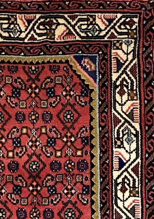 A FINE WOOLLEN PILE PERSIAN ENJELAS RUG WITH NATURAL DYES. HAND-KNOTTED VILLAGE WEAVE FROM THE HAMADAN REGION WITH DESIGN OF ALL-OVER HERATI MAHI MOTIFS. SCROLL-PATTERNED BORDER. THE ENTIRE IN SHADES OF RED, CREAM, CHARCOAL & GREEN. SIZE: 150 X 105 CM - ORIGIN: IRAN