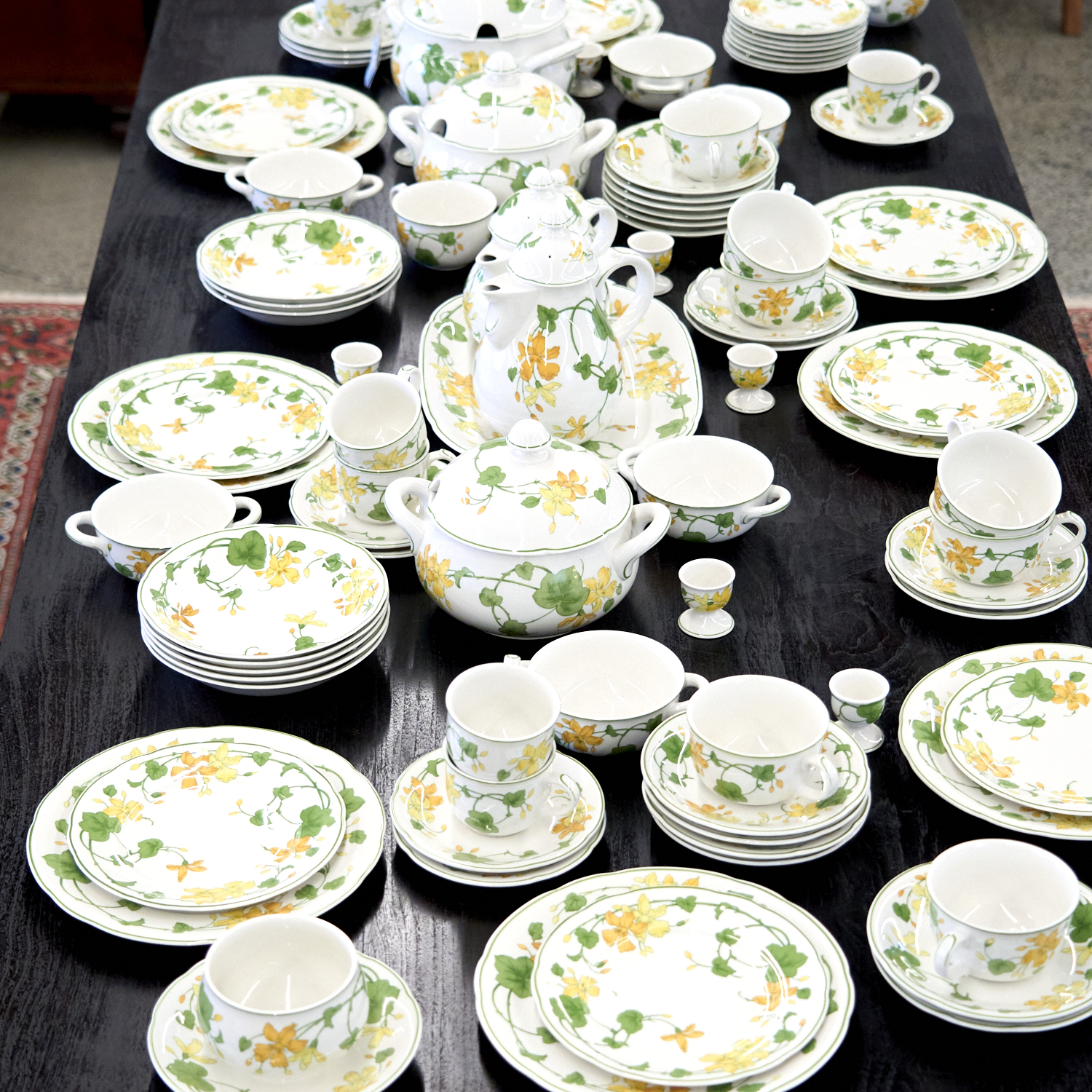 AN EXTENSIVE SUITE OF VILLEROY AND BOCH GERANIUM PATTERN TABLEWARE FOR EIGHT COMPRISING DINNER PLATES, SIDE PLATES, BOWLS, THREE TUREENS, TEA AND COFFEE POTS, CUPS AND SAUCERS, AND EGGCUPS (MISSING ONE TEACUP)