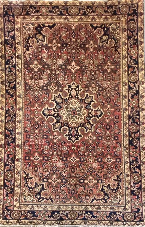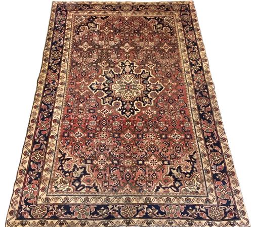 A WOOLLEN PILE PERSIAN HOSSAINABAD RUG WITH NATURAL DYES & A SEMI-VINTAGE PILE. HAND- KNOTTED VILLAGE WEAVE FROM THE HAMADAN REGION WITH DESIGN OF FLORAL MEDALLION IN A FIELD OF HERATI MAHI MOTIFS. BORDER OF ROSETTES. SIZE: 212 X 153 CM - ORIGIN: IRAN