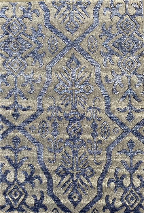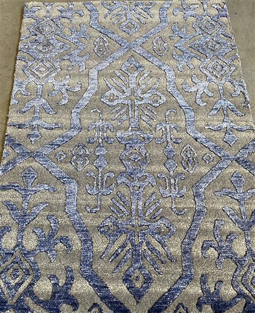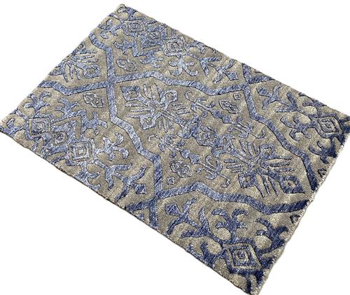 A MODERN DESIGNER RUG WITH A WOOLLEN PILE IN GREY AND SILK TEXTURED SILVER-BLUE EMBOSSED PATTERNS. SIZE: 90 X 60 CM - ORIGIN: AGRA