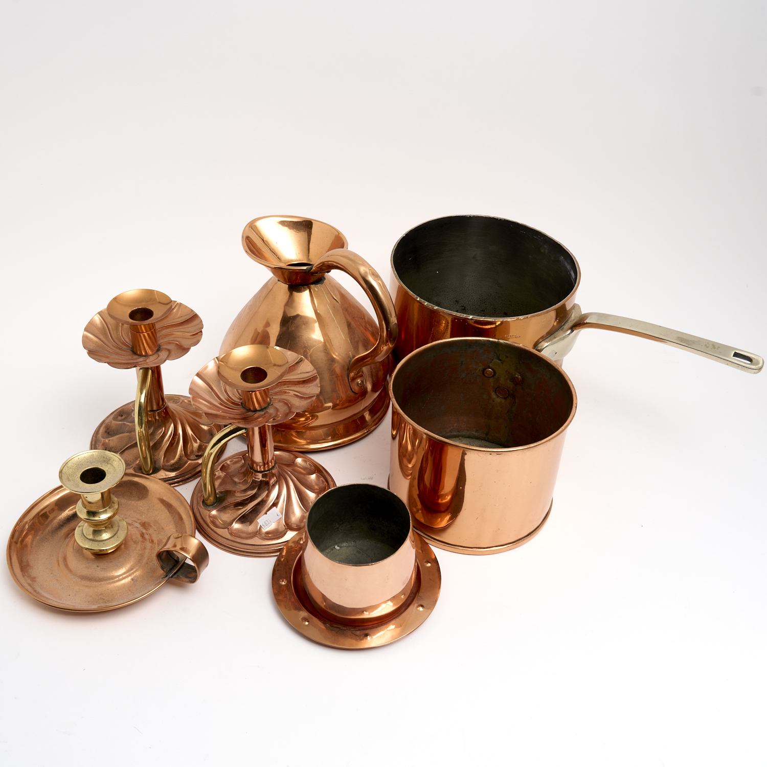 A GROUP OF COPPER WARE INCLUDING A HEAVY SAUCEPAN, JUG, POTS, AND CANDLE HOLDERS (A/F) H.20CM (TALLEST)