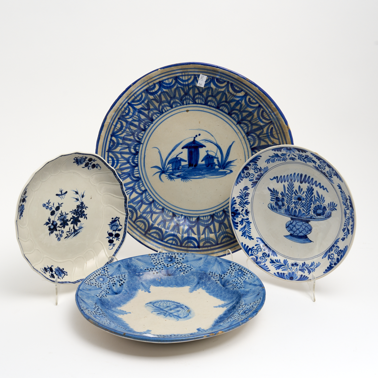 THREE ANTIQUE TIN GLAZE PLATES AND A TOURNAI DISH (A/F) DIA.35CM (LARGEST)