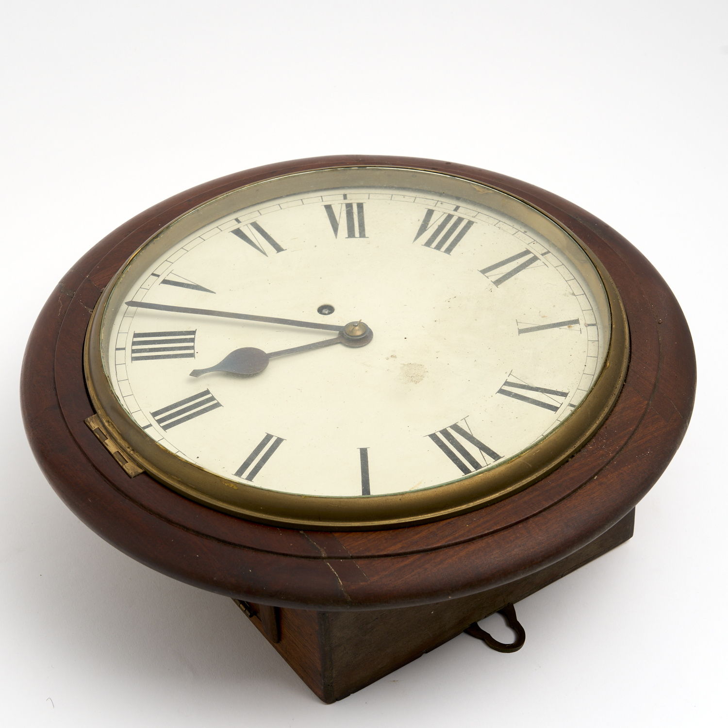 A 19TH CENTURY RAILWAY CLOCK (NO PENDLUM) DIA.41CM