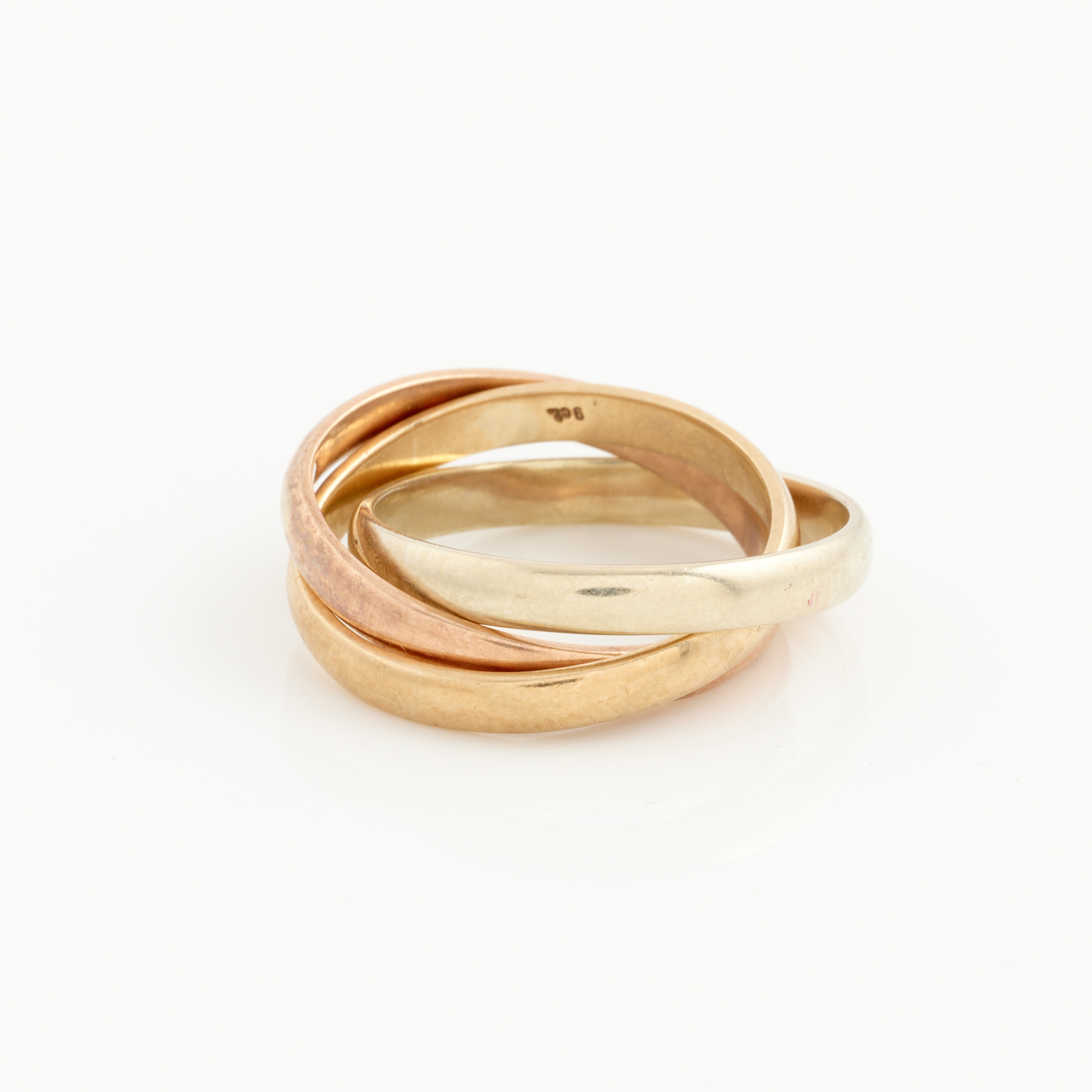 A RING IN THREE TONE 9CT GOLD, SIZE I, 5.0GMS
