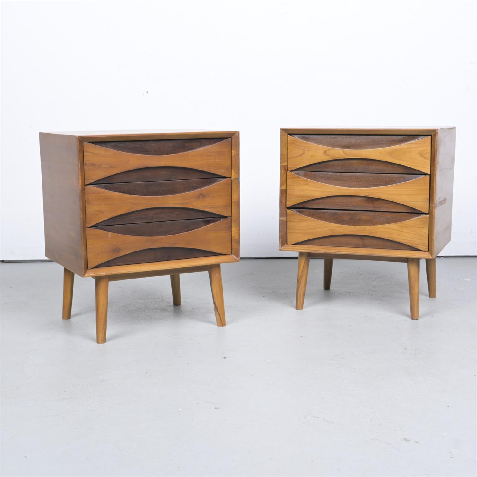 A PAIR OF MID-CENTURY STYLE BEDSIDE DRAWERS (60H X 50W X 40D CM)