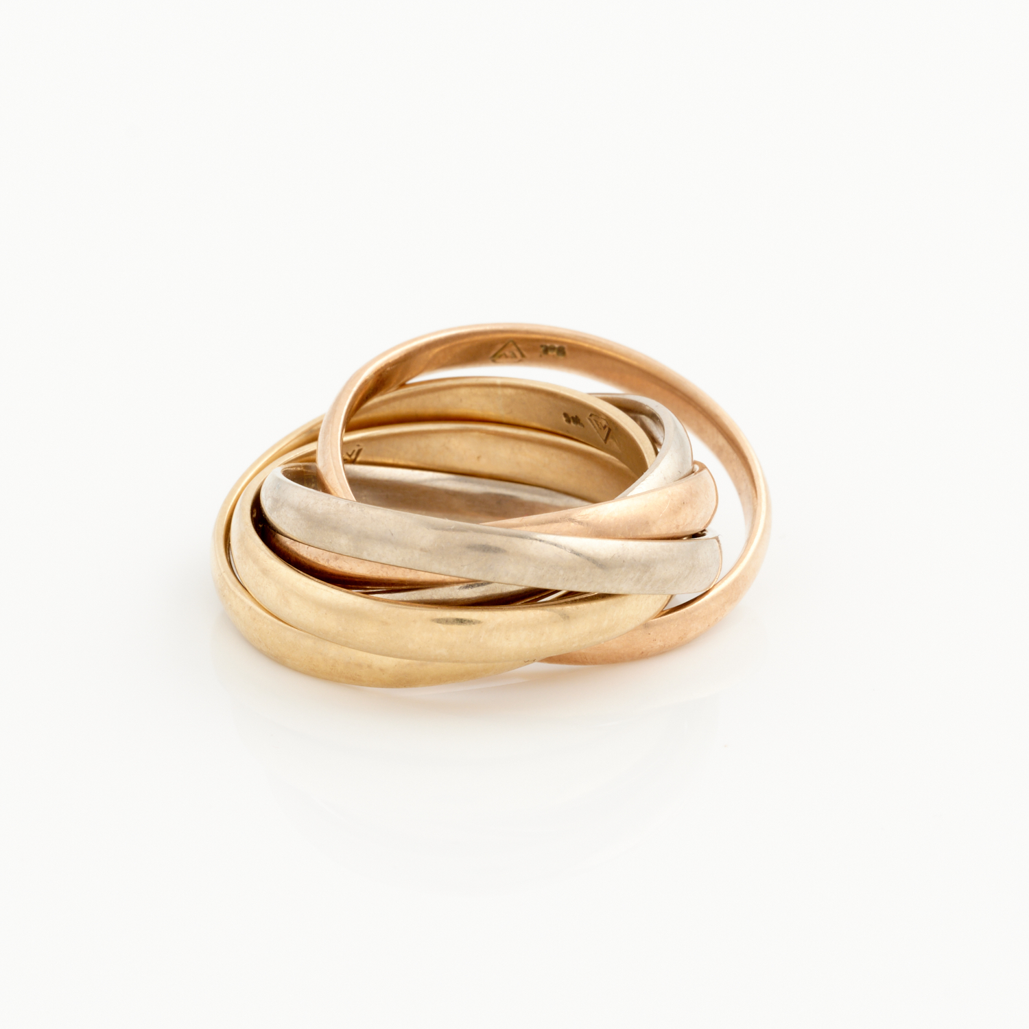 A RING IN 9CT THREE TONE GOLD, SIZE Q, 16.3GMS