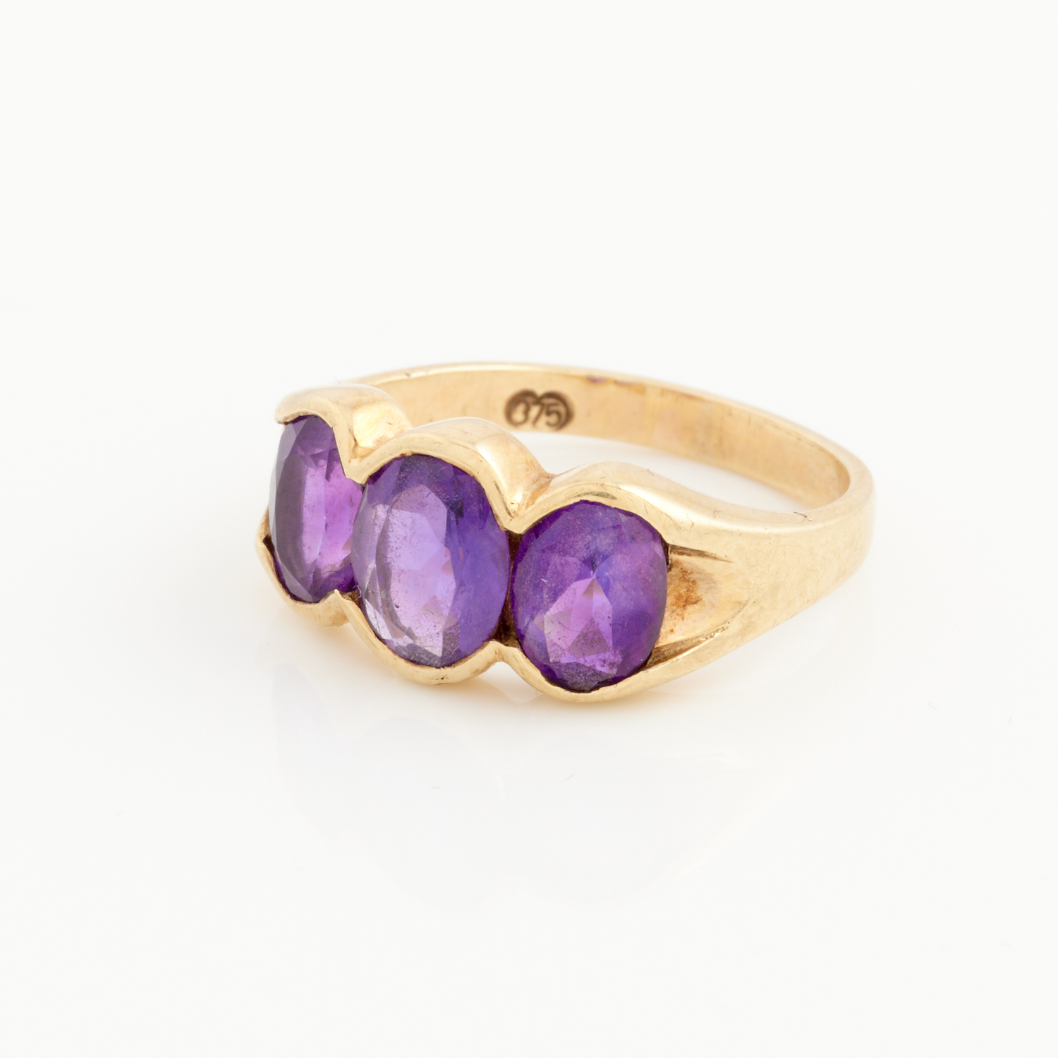 AN AMETHYST RING IN 9CT GOLD, SIZE K 1/2, 3.5GMS