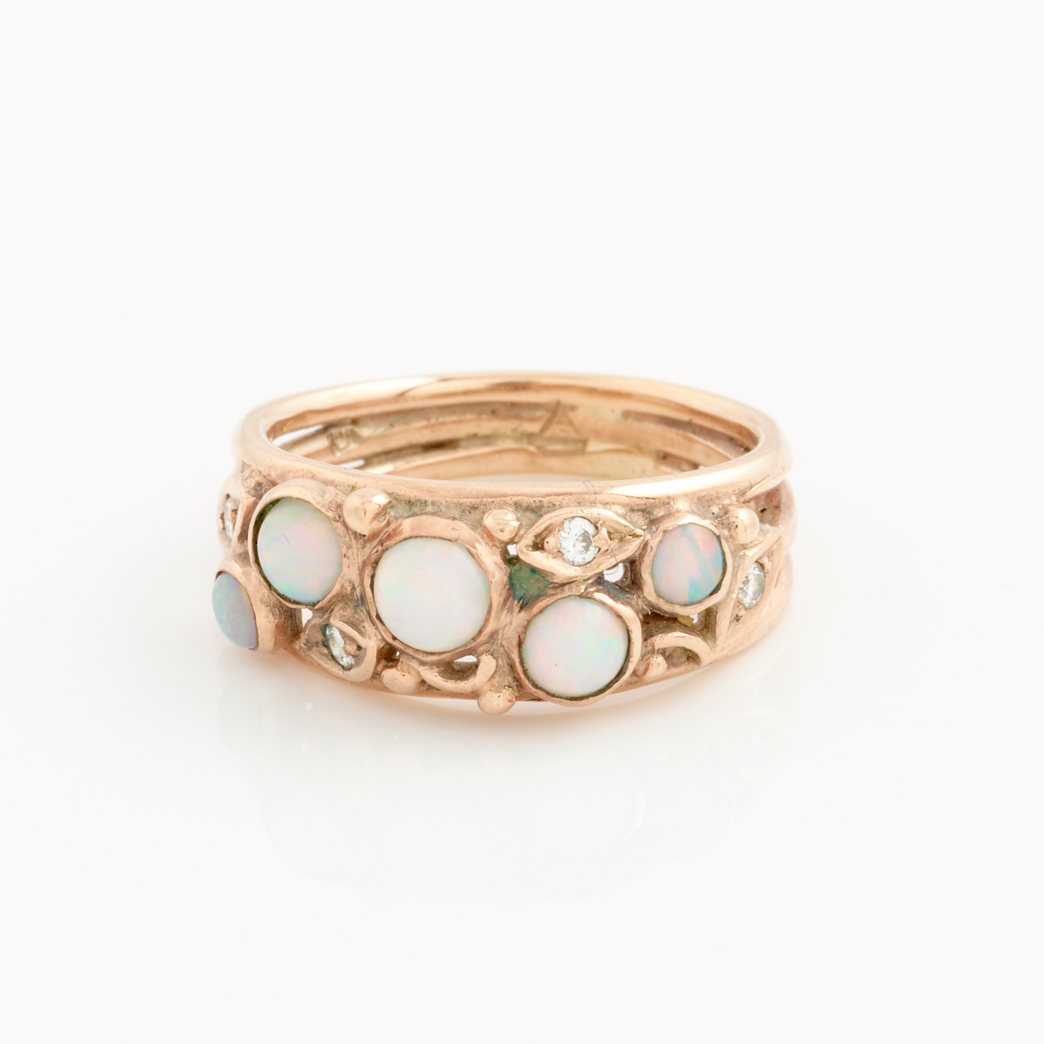 AN OPAL AND DIAMOND RING IN 9CT ROSE GOLD, SIZE K, 3.8GMS