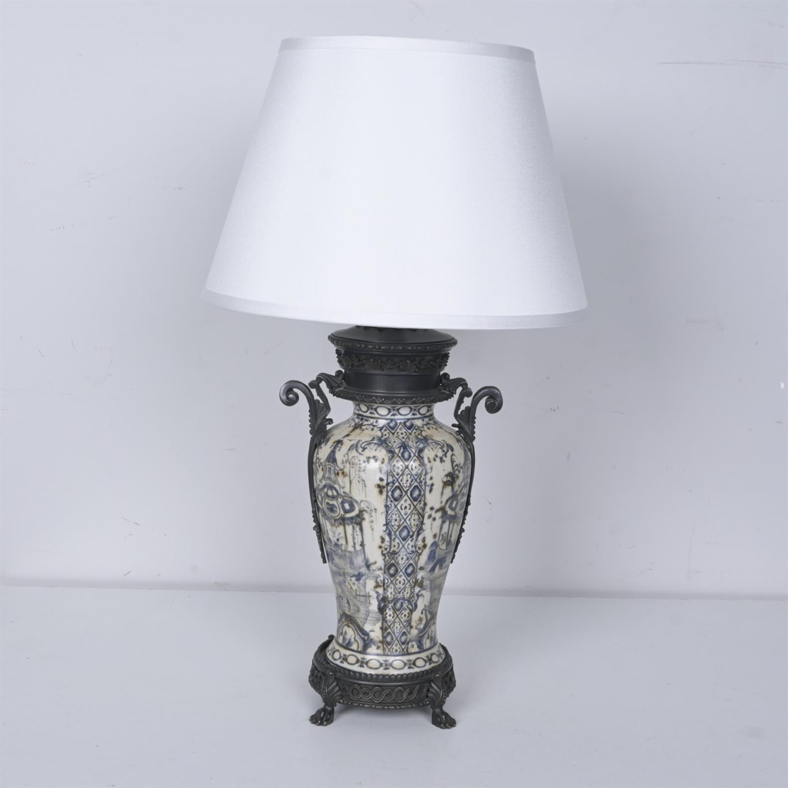 A PORCELAIN BASE TABLE LAMP WITH METAL DETAIL (71CM H)