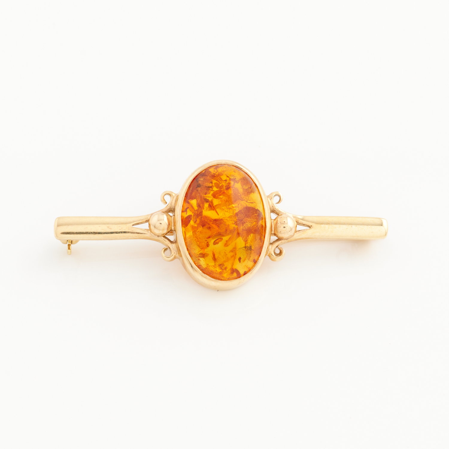 AN AMBER BROOCH IN 9CT GOLD, 50MM, 6.8GMS