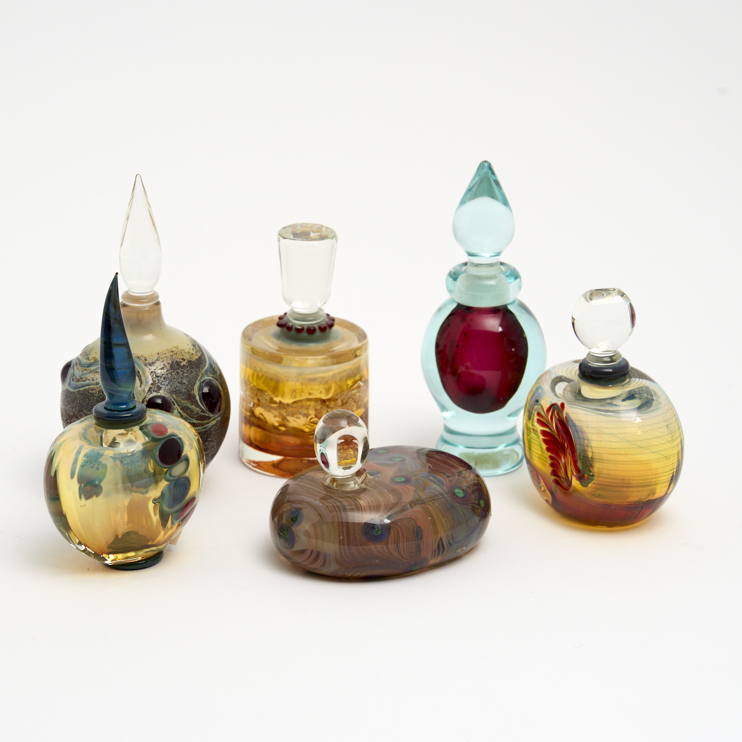 A GROUP OF FIVE PERFUME BOTTLES BY RICHARD CLEMENTS, TOGETHER WITH ONE MURANO PERFUME BOTTLE H.12CM (TALLEST)