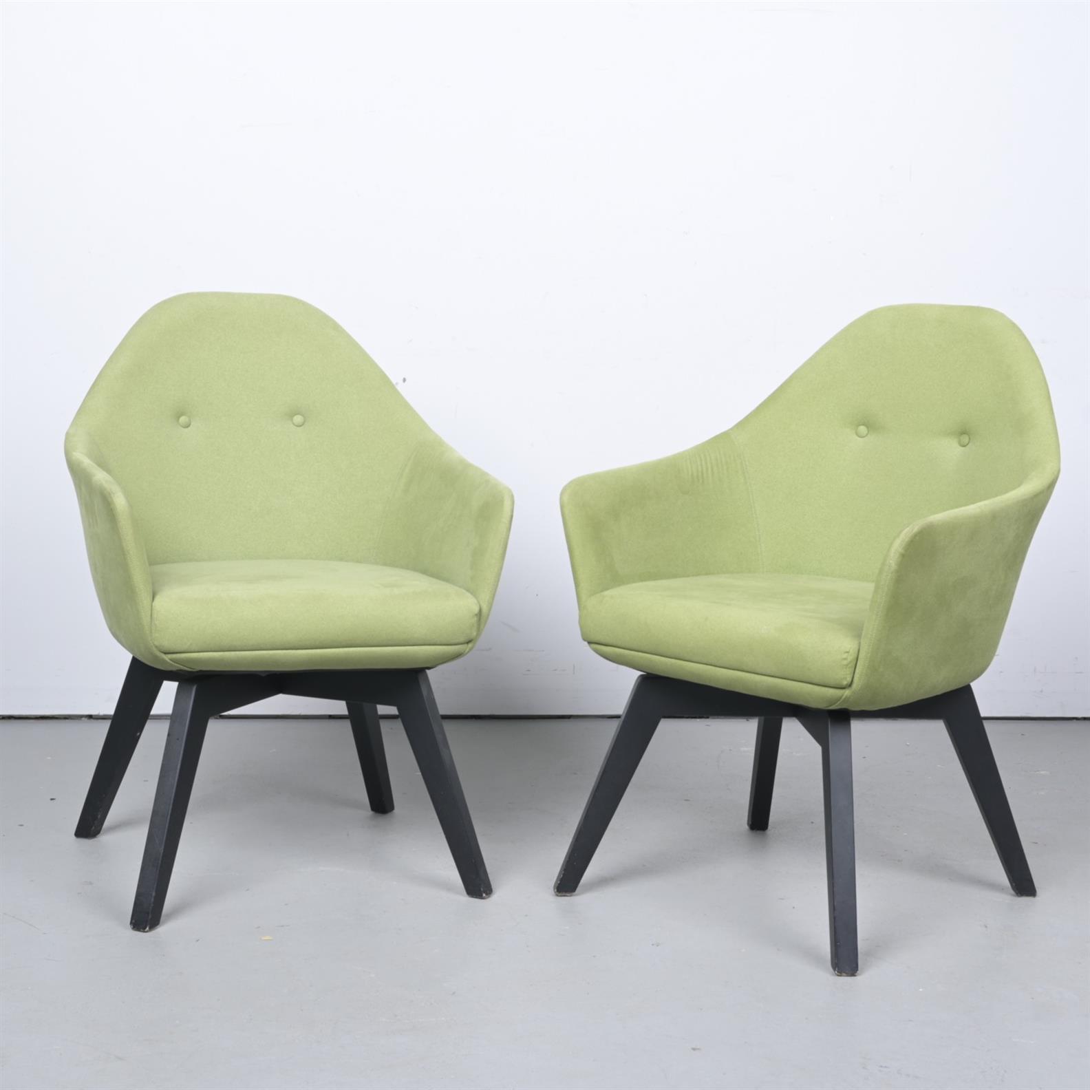 A PAIR OF CONTEMPORARY GREEN UPHOLSTERED OCCASIONAL CHAIRS (91CM H X 64CM W X 65CM D)