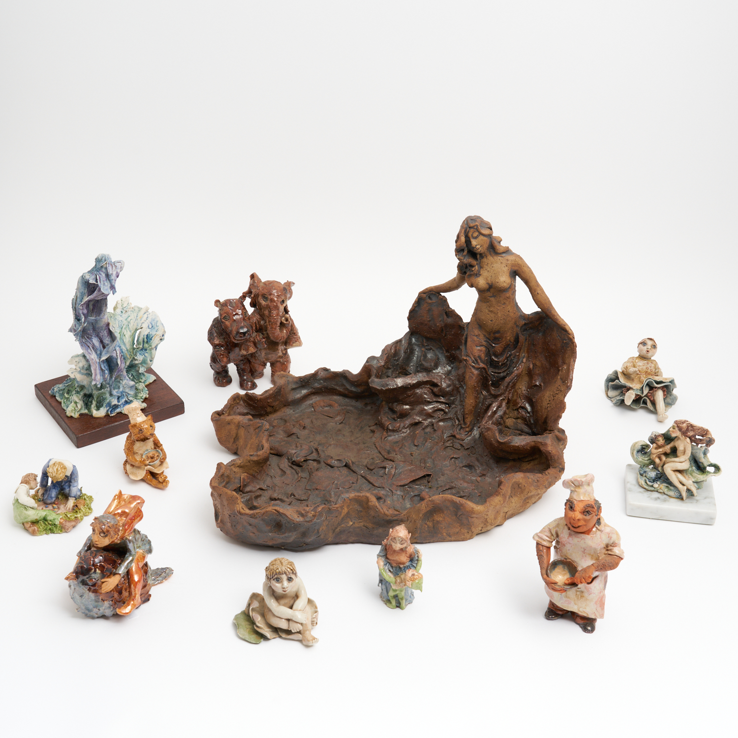 A LARGE COLLECTION OF CLAY FIGURINES BY JENNIFER GIBNEY INCLUDING A LARGER SCULPTURE OF A MAIDEN BY THE WATER H.31CM (A/F) (LARGEST)
