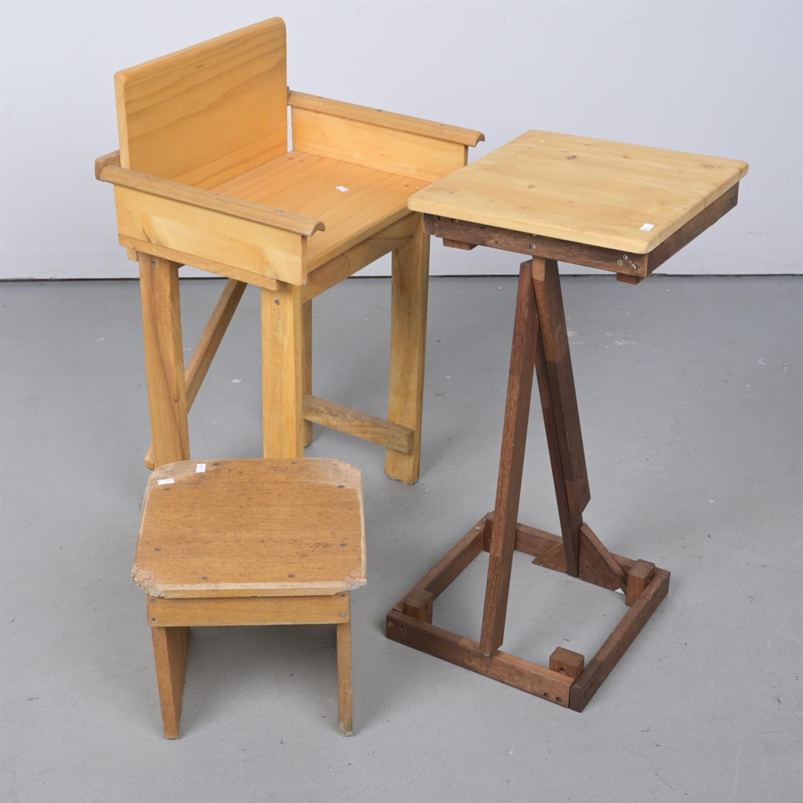 A CHILD'S CHAIR AND A TABLE TOGETHER WITH A FOOT STOOL (A/F) (77H CM)
