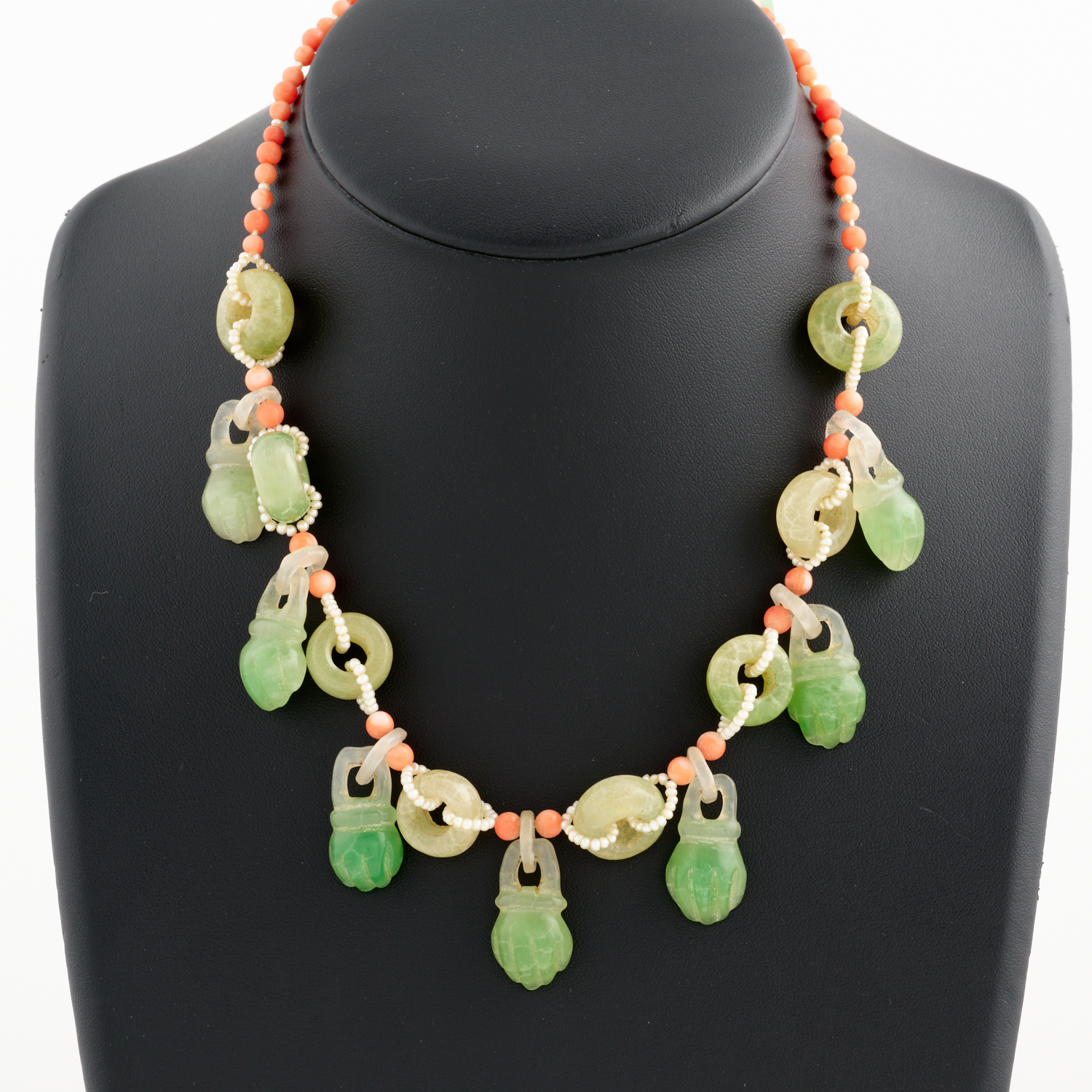 A JADE, CORAL AND SEED PEARL NECKLACE, WITH ONE EARRING