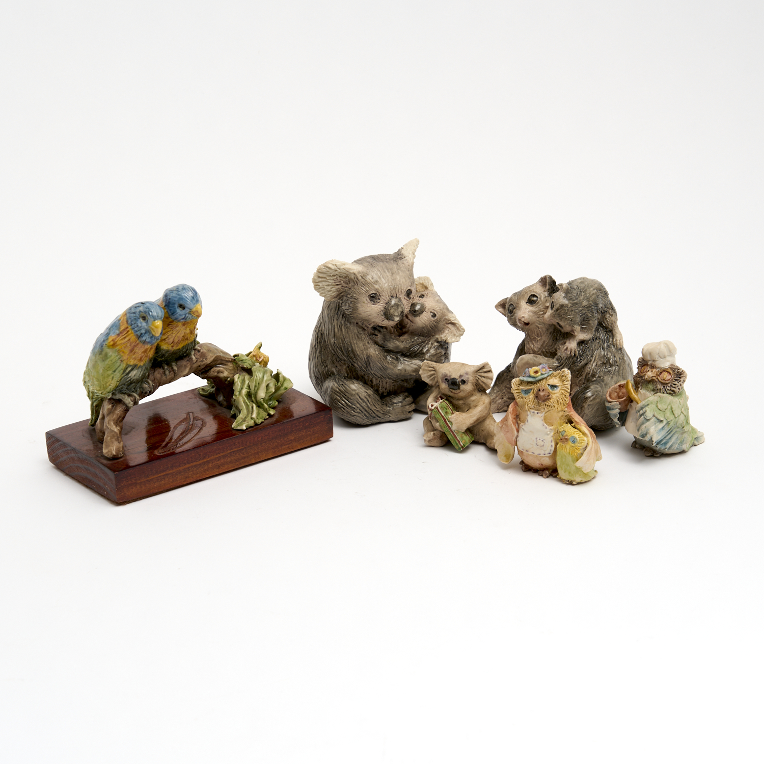 A GROUP OF CLAY FIGURES OF AUSTRALIAN ANIMAL BY JENNIFER GIBNEY H.12CM (TALLEST)