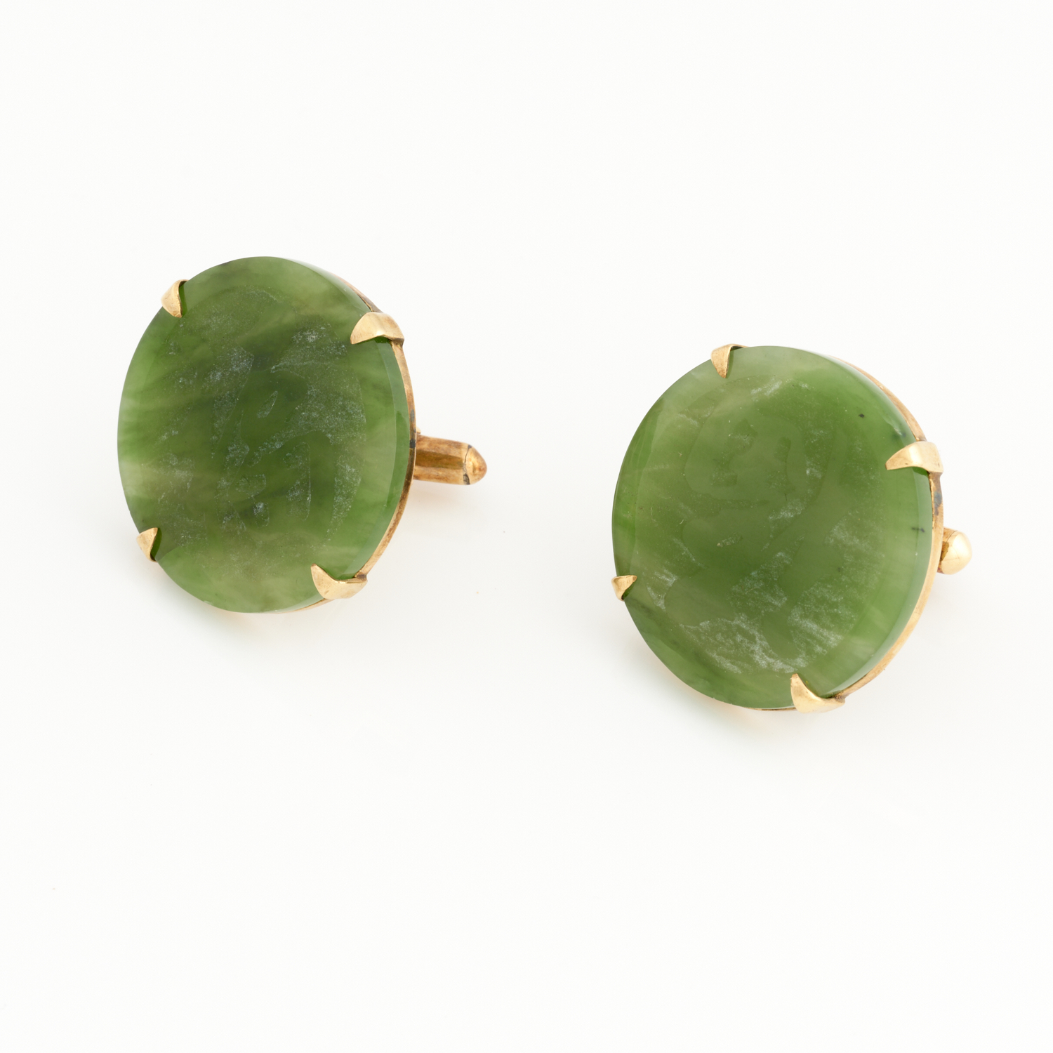 A PAIR OF 'GOOD FORTUNE' ENGRAVED JADE CUFFLINKS IN GOLD PLATE, DIAMETER 30MM, 24.6GMS