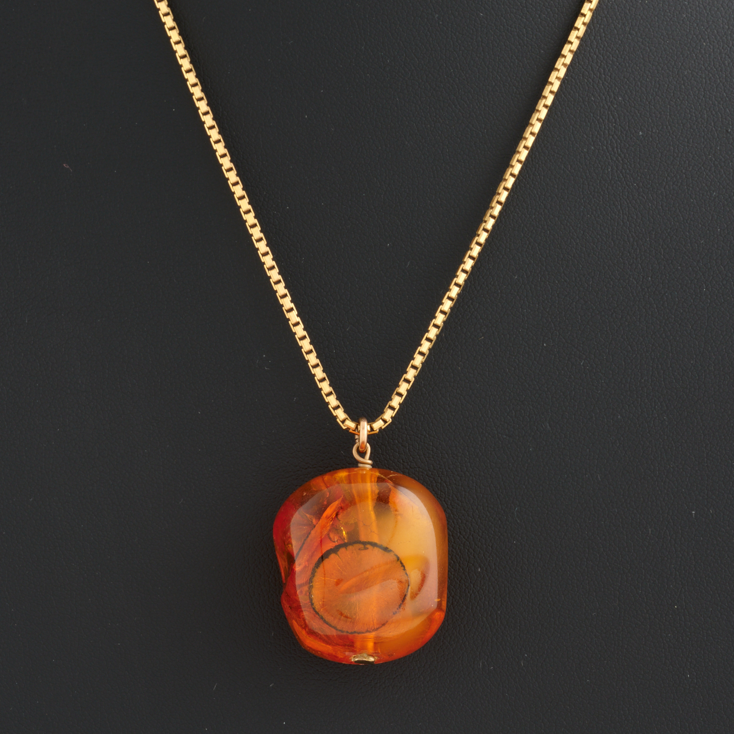 AN AMBER PENDANT NECKLACE IN 9CT GOLD, PENDANT LENGTH 30MM, CHAIN 500MM, 17.3GMS