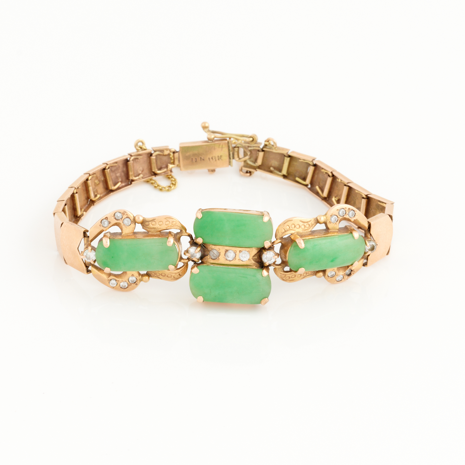 A JADE AND WHITE GEM BRACELET IN 14CT GOLD