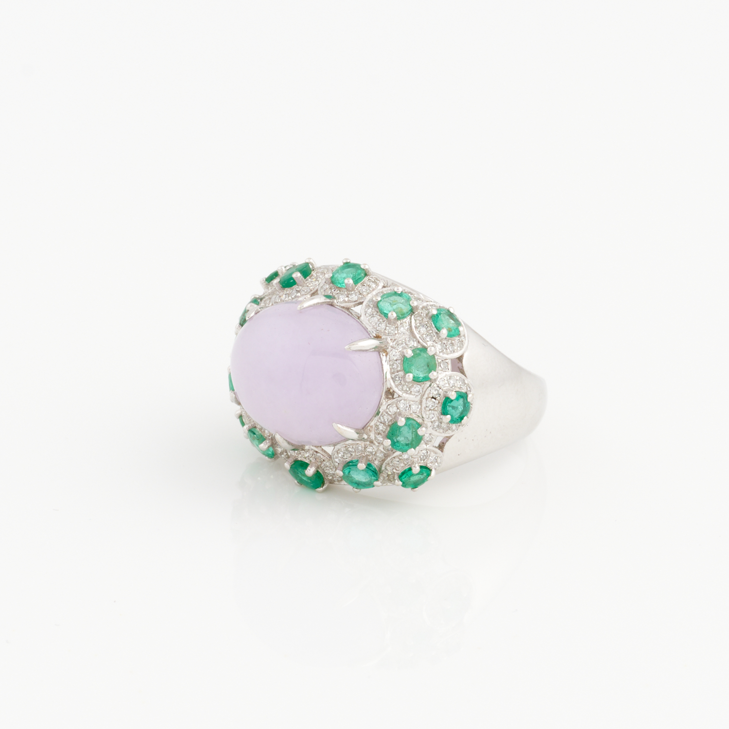 A LAVENDER JADE, EMERALD AND DIAMOND RING IN 9CT WHITE GOLD