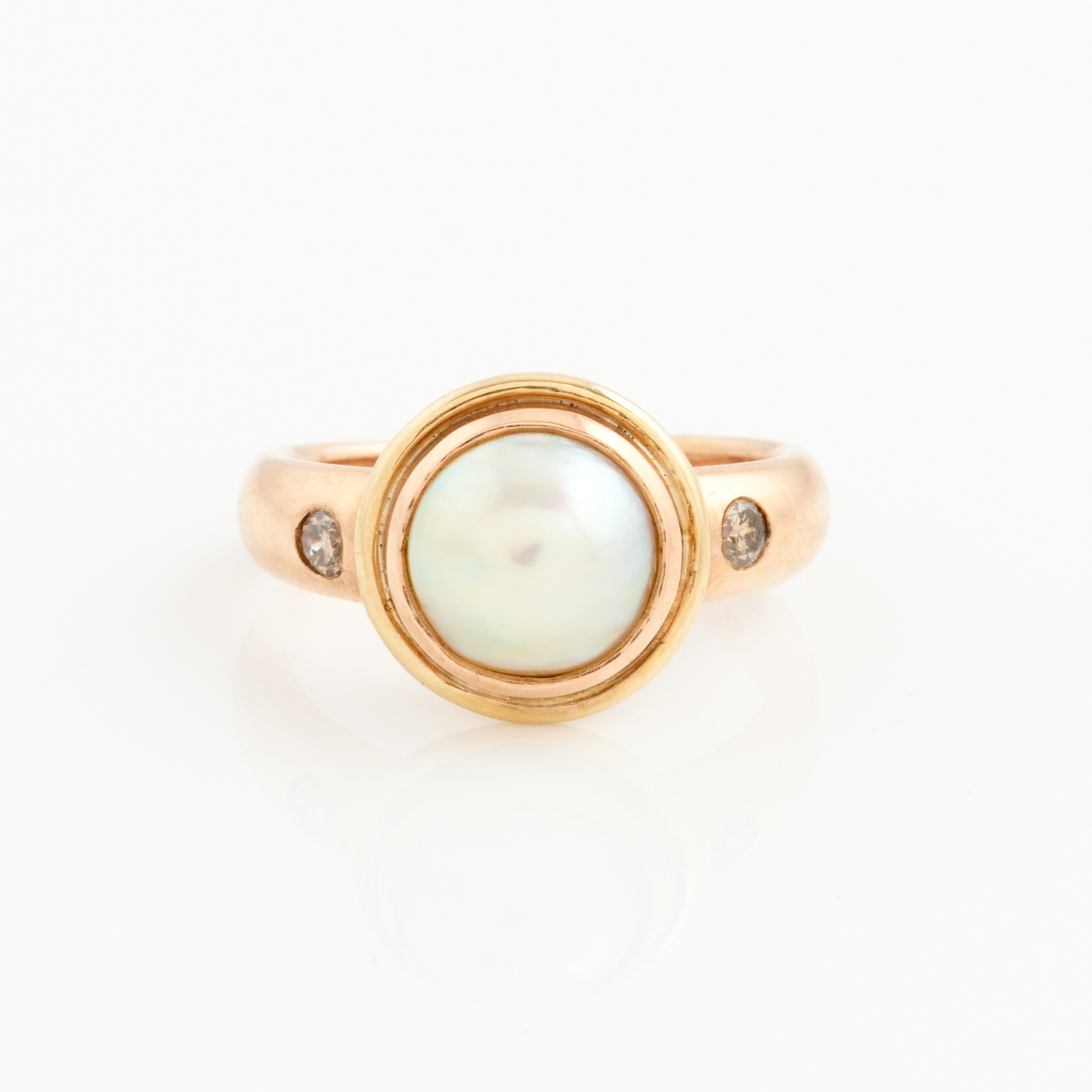A MABE PEARL AND DIAMOND RING IN 9CT GOLD, SIZE R, 7.4GMS