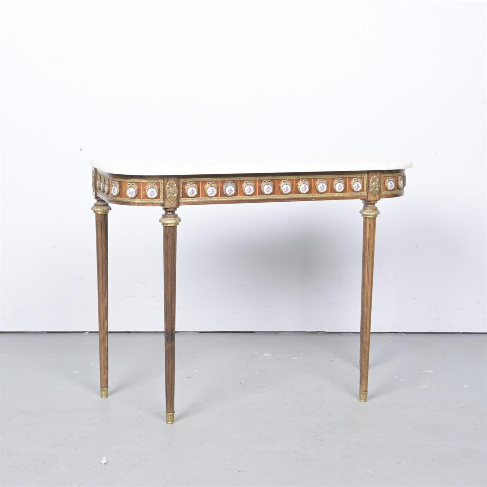 A MARBLE TOPPED HALL TABLE (76CM H X 98CM W X 36CMD)
