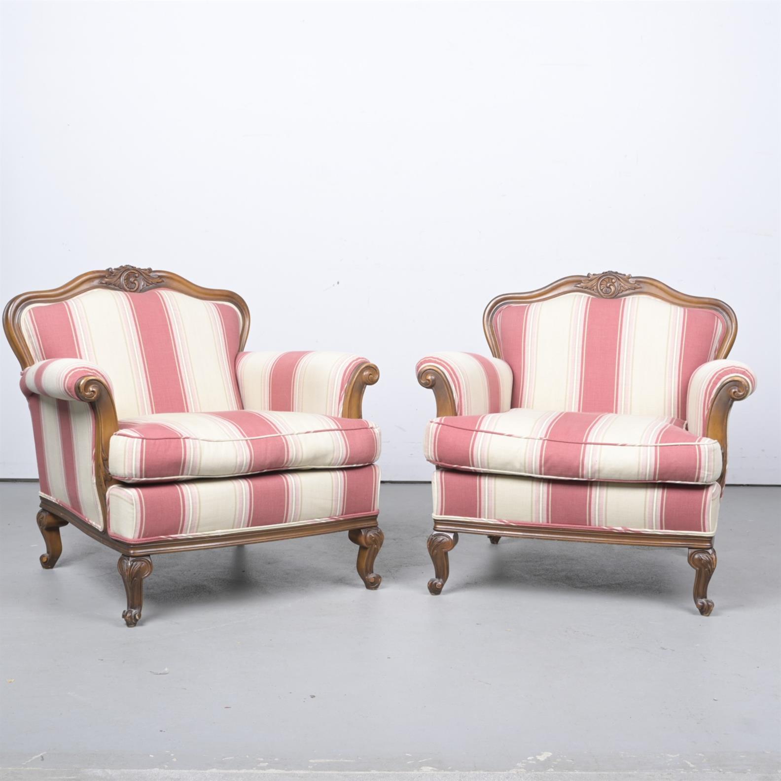 A PAIR OF OAK AND UPHOLSTERED ARMCHAIRS IN ANTIQUE MANNER, IN STRIPED FABRIC  (80CM X 75CM W X 84CM D)