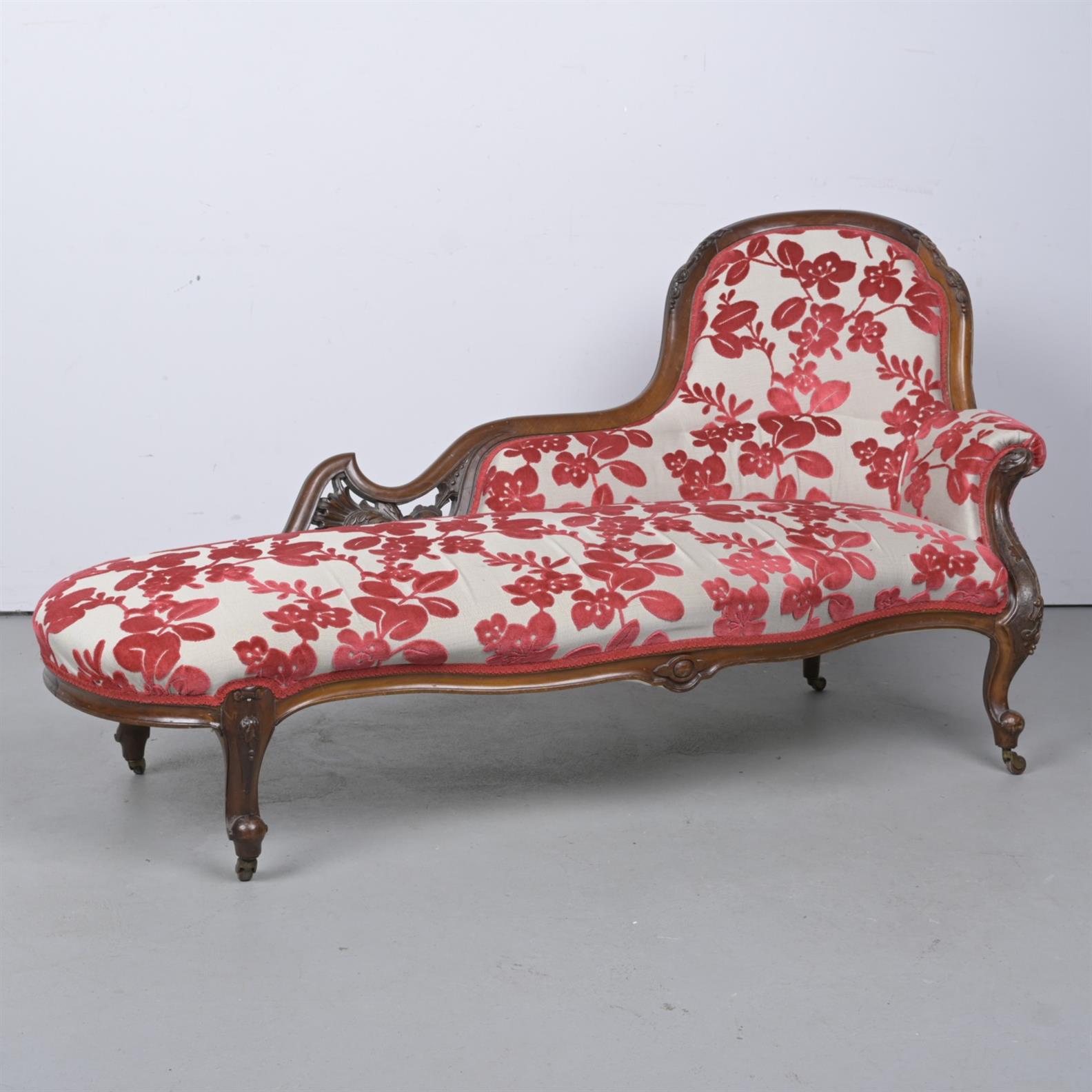 A VICTORIAN WALNUT AND UPHOLSTERED CHAISE LONGUE (90H X 170W X 78D CM) (THIS ITEM MUST BE REMOVED BY CARRIERS AT THE CUSTOMER'S EXPENSE. LEONARD JOEL STAFF CANNOT ASSIST CARRYING THIS ITEM)