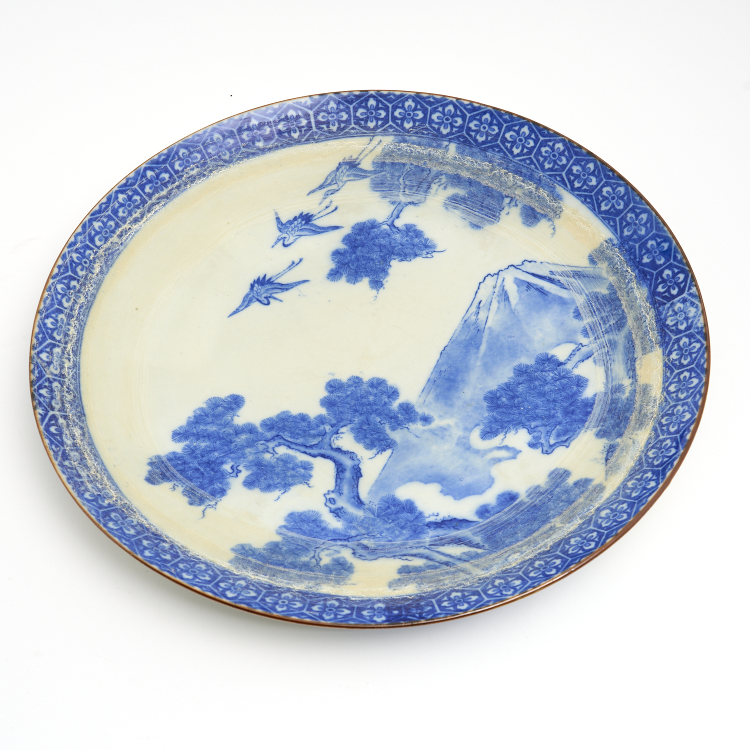 A LARGE 19TH CENTURY JAPANESE BLUE AND WHITE CHARGER (MINERAL REMANTS TO SURFACE) DIA.45CM