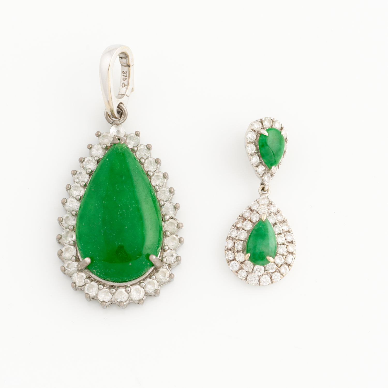 A PAIR OF JADE AND WHITE GEM PENDANTS IN 9CT AND 18CT WHITE GOLD