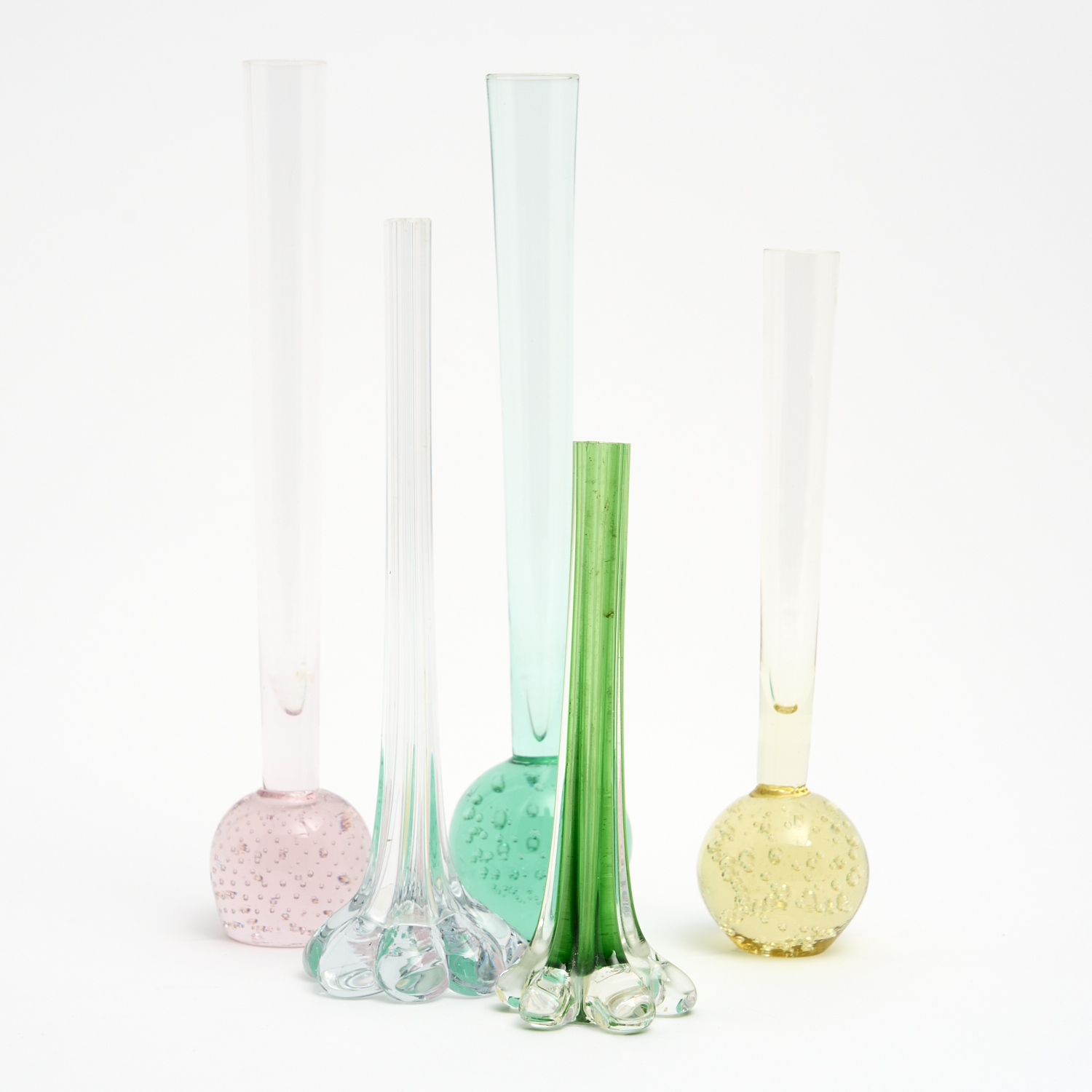 A COLLECTION OF FIVE BUD VASES, THREE WITH CONTROLLED AIR BUBBLES H.25CM (TALLEST)