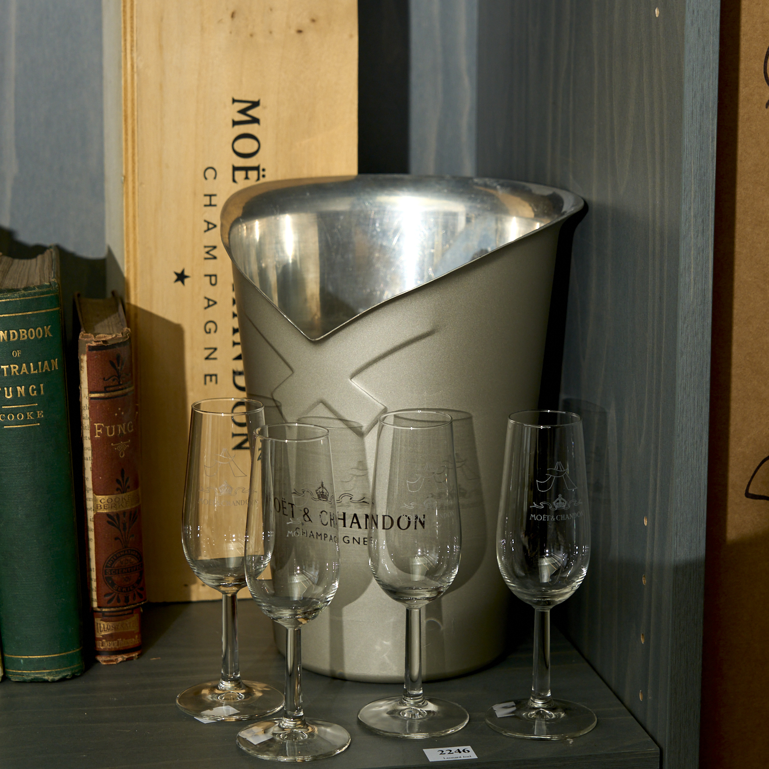 A VINTAGE MOET & CHANDON CHAMPAGNE BUCKET WITH FOUR ETCHED MOET & CHANDON CLEAR GLASSES TOGETHER WITH AN ORIGINAL WOODEN MOET & CHANDON BOX L.41CM (LARGEST)