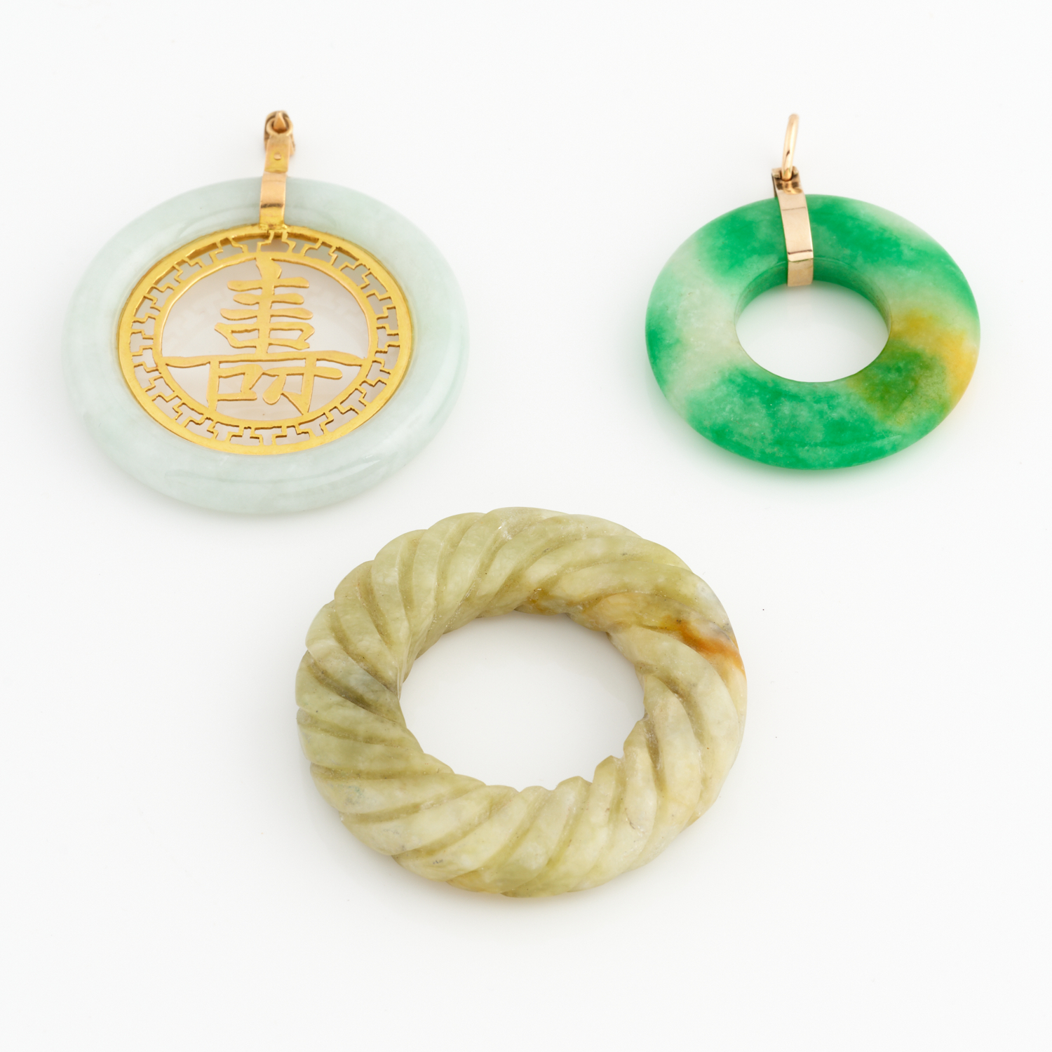 A COLLECTION OF JADE PENDANTS, ONE IN 14CT GOLD