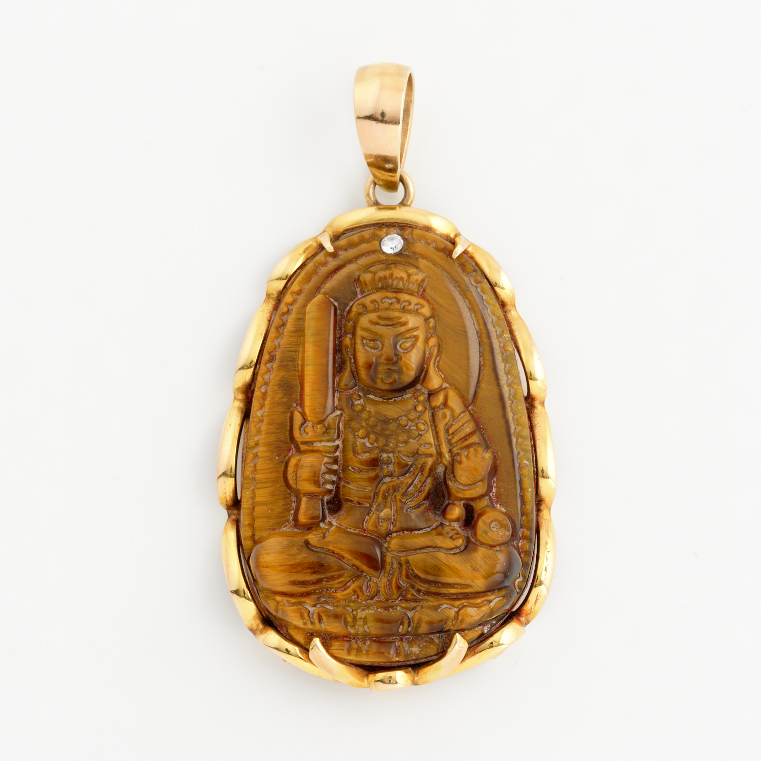 A CARVED TIGERS EYE PENDANT IN GOLD TONE METAL, 60 X 35MM